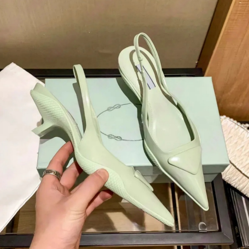 รองเท้าส้นเตี้ยแบบใหม่ปี 2026 ยี่ห้อ P ทำจากหนังแท้ หัวแหลม ส้นสูงด้านหลัง