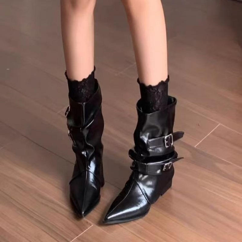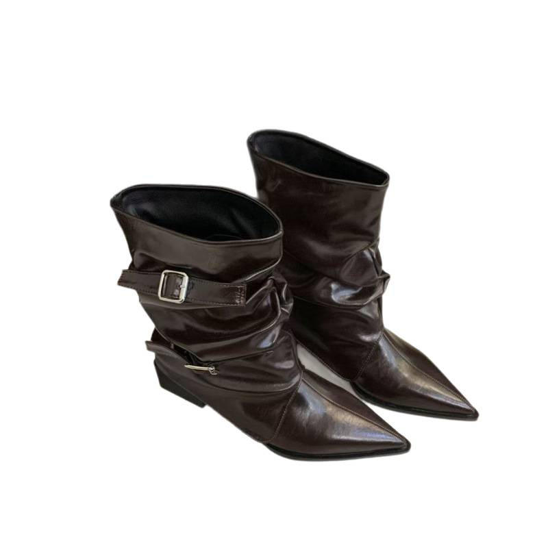 รองเท้าบูทผู้หญิงทรงหัวแหลมสไตล์เรโทรปี 2026 ดีไซน์จีบแบบมีสไตล์ หนังนุ่มใส่สบาย ทรงกระบอก ช่วยให้ขาดูเรียวเล็ก