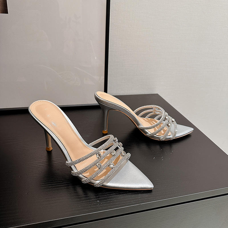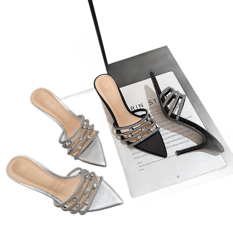 รองเท้าส้นสูงแบบสวมประดับคริสตัลผ้าไหมซาตินปี 2026 สำหรับผู้หญิง ส้นบาง ปลายแหลม เปิดนิ้วเท้า พื้นยาง รองเท้าแตะสำหรับงานแต่งงาน