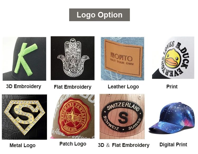 Logo position:brim/visor, front panel, Left panel, Right Panel, back curved part