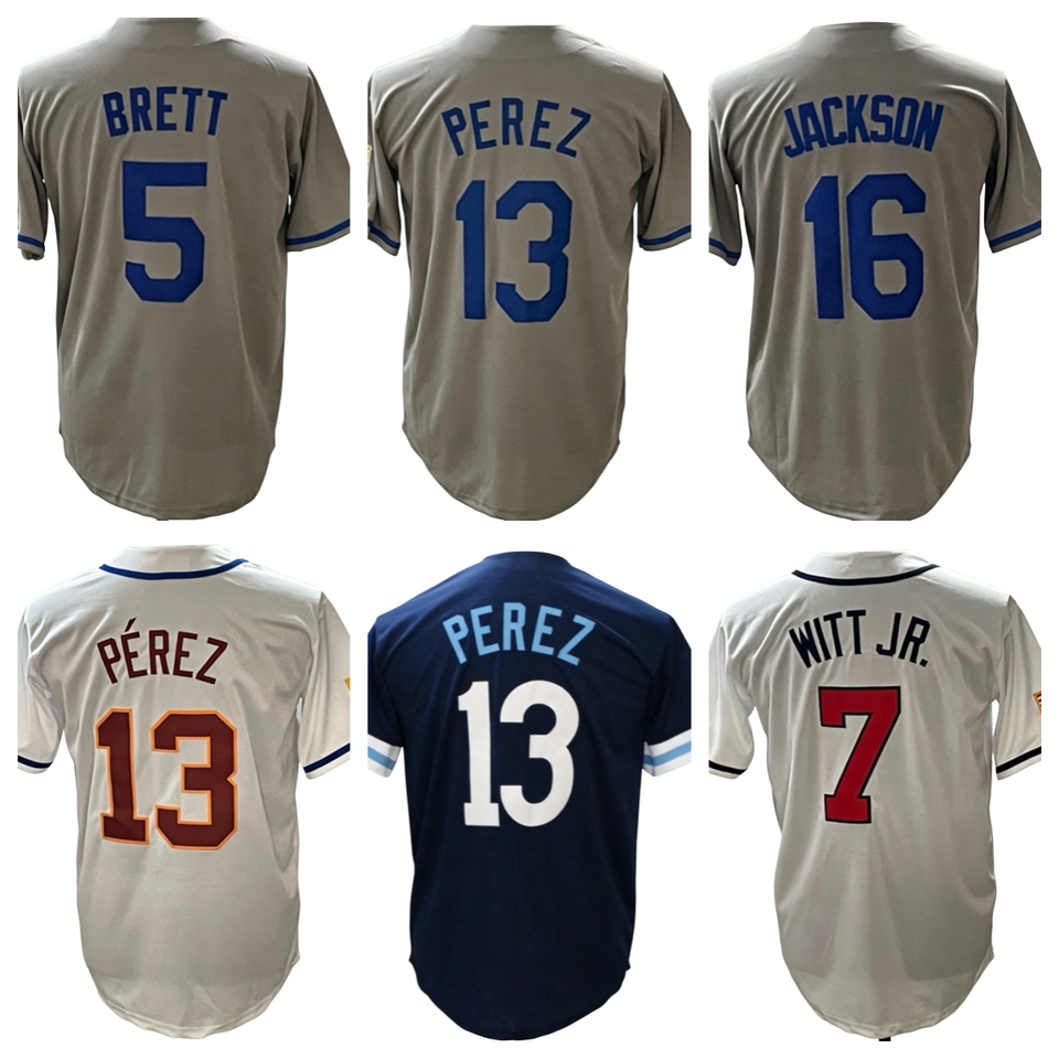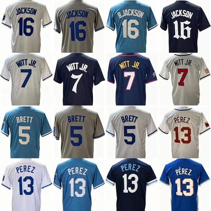 เสื้อเบสบอลอเมริกันแบบเย็บติดปี 2026 รุ่นใหม่ ราคาถูก หมายเลข 7 บ็อบบี้ วิท จูเนียร์ 16 โบ แจ็กสัน 13 ซัลวาดอร์ เปเรซ 5 เบรตต์