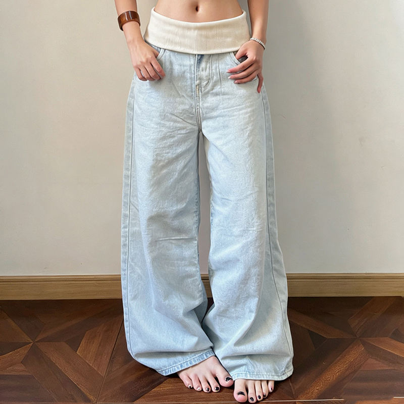 กางเกงยีนส์ทรงตรงเอวพับสไตล์วินเทจอเมริกัน Y2K สำหรับผู้หญิงรุ่นใหม่ปี 2026 ขายส่ง
