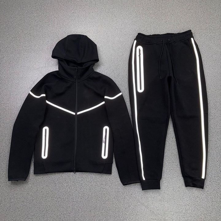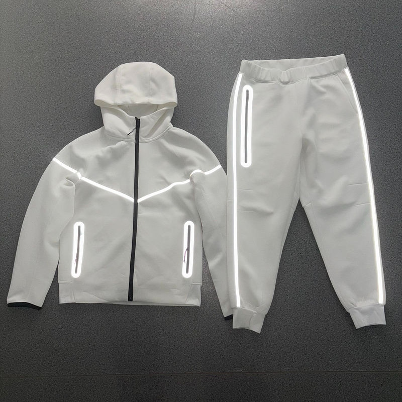 ชุดวอร์มผู้ชายแบบสะท้อนแสงแฟชั่นฤดูใบไม้ผลิ ODM ปี 2026 ผ้าฟลีซเทคโนโลยีพิเศษ 2 ชิ้น เสื้อฮู้ดดี้ทรงโอเวอร์ไซส์หนานุ่ม กางเกงลายการ์ตูน