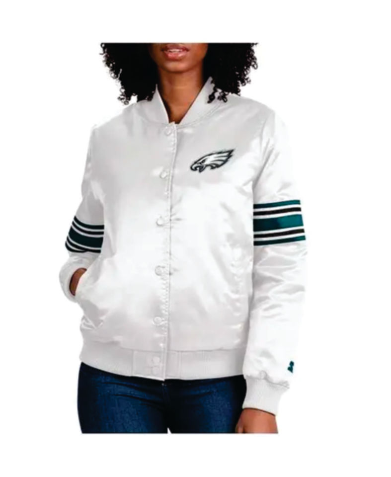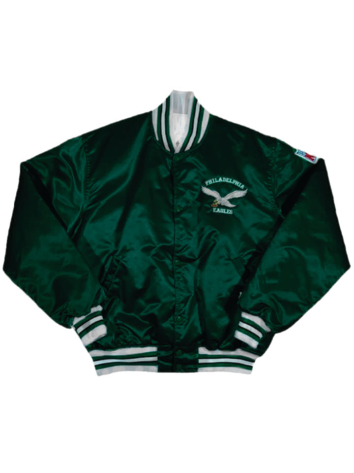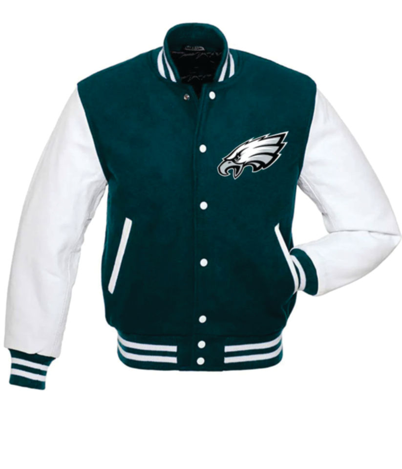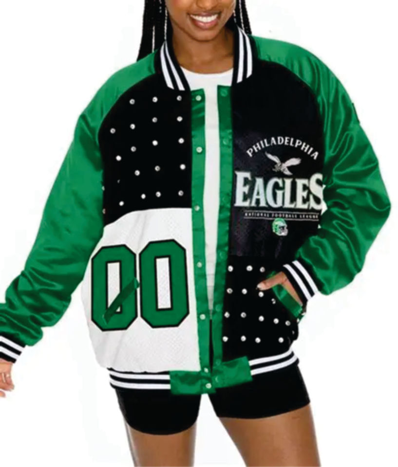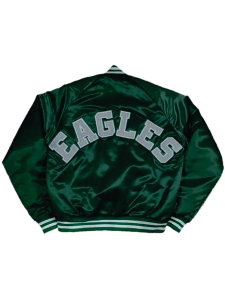 เสื้อแจ็คเก็ตเบสบอลสีเขียวขาวแบบซาตินสำหรับทีมฟุตบอลอเมริกัน ยูนิเซ็กซ์ รุ่นวาร์ซิตี้ ปี 2026 สำหรับฟิลาเดลเฟีย แบบกลับด้านได้ เป็นมิตรกับสิ่งแวดล้อม