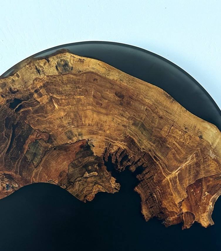 งานศิลปะติดผนังเรซิ่นลายไม้เบิร์ลสวีเดน ขนาด 33 นิ้ว รุ่นพรีเมียม ปี 2026 ผลิตด้วยมือ ฝังไม้เบิร์ลในอีพ็อกซี่สีดำด้าน สำหรับตกแต่งผนังด้วยสไตล์ดีไซเนอร์