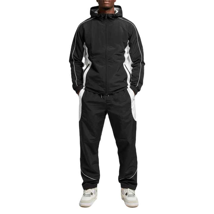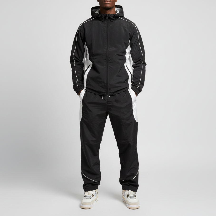 ชุดวอร์มกันลมไนลอนคุณภาพสูงระดับพรีเมียม ปี 2026 ชุด 2 ชิ้น พร้อมปักโลโก้ตามสั่ง แต่งขอบด้วยผ้าทอ ชุดกีฬาสีพื้นเรียบสำหรับผู้ชาย