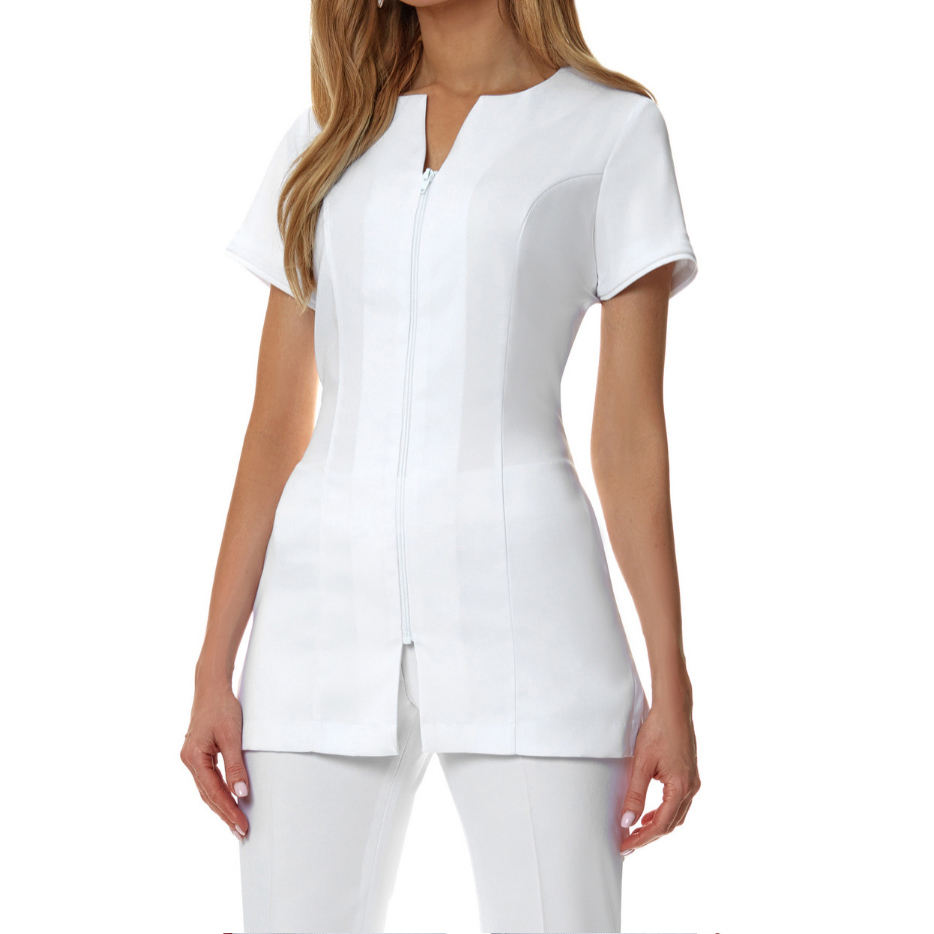 ชุดยูนิฟอร์มทำงานสำหรับพนักงานเสริมสวยหญิง ปี 2026 ผ้าคอตตอนผสมสแปนเด็กซ์ แขนสั้น ทรงเสื้อคลุม สำหรับโรงแรมและร้านเสริมสวย