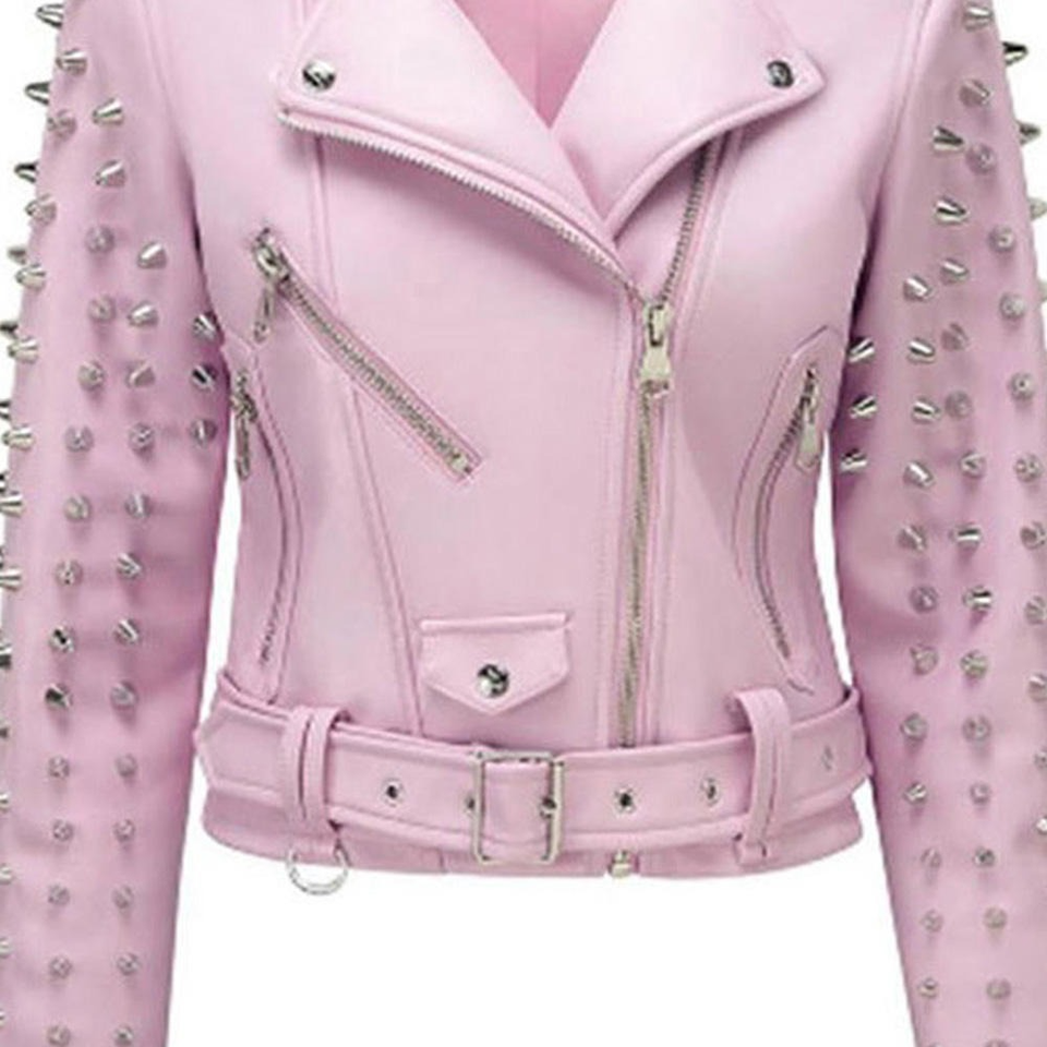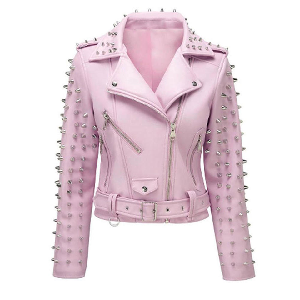 แจ็คเก็ตหนังทรงสลิมฟิตสำหรับผู้หญิง ปี 2026 แฟชั่นใหม่ หนังแท้ ประดับหมุด แจ็คเก็ตสำหรับกิจกรรมกลางแจ้ง รับสกรีนโลโก้ แจ็คเก็ตหนังผู้หญิง