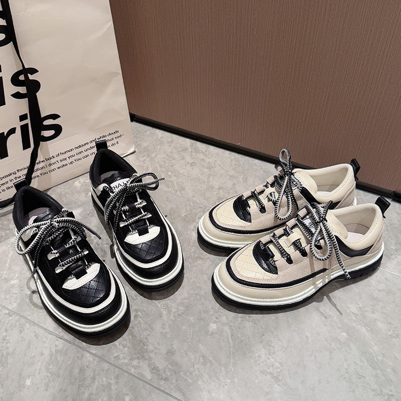 รองเท้าผ้าใบผู้หญิงสไตล์เซียวเซียงเฟิง หนังวัว พื้นหนา แบบผูกเชือก รุ่นแพนด้า ดีไซน์ทันสมัย ระบายอากาศได้ดี ทนทาน เพิ่มความสูง คอลเลคชั่นฤดูใบไม้ผลิ 2026