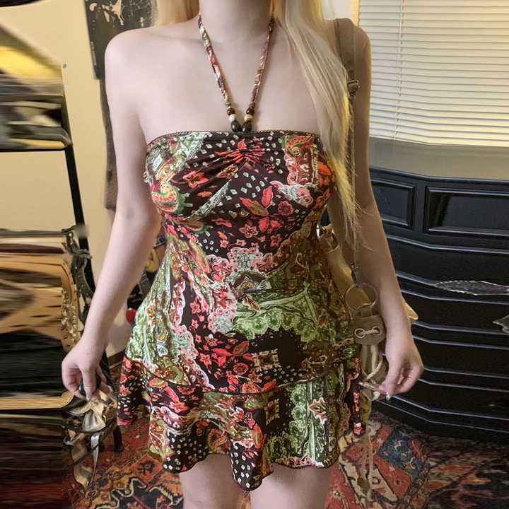 เดรสสั้นทรงเอไลน์ลายดอกไม้ปะติดปะต่อประดับลูกปัดแบบผูกคอ เปิดหลัง สไตล์โบฮีเมียน สำหรับฤดูใบไม้ผลิ/ฤดูร้อน ปี 2026 ผลิตจากวัสดุธรรมชาติรักษ์โลก เหมาะสำหรับใส่ไปชายหาด