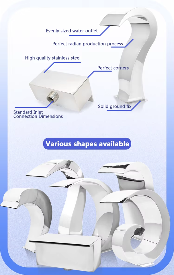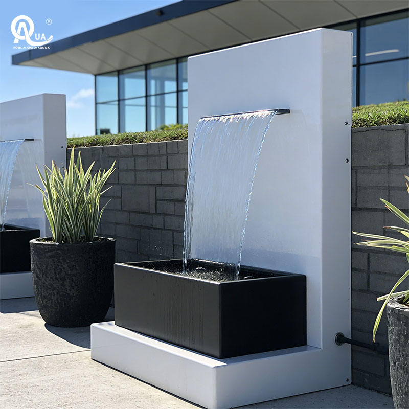 น้ำพุตกแต่งสวนกลางแจ้งแบบมีไฟ รุ่นโมเดิร์น ปี 2026 ทำจากสแตนเลส 304 สำหรับตกแต่งผนังสระว่ายน้ำ รูปแบบ WATER CROWN