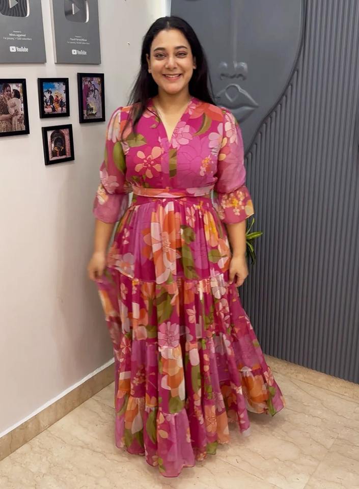 เดรสแฟชั่นจีนน่ารักสไตล์ลำลองลายดอกไม้สำหรับฤดูร้อนปี 2026 ไซส์ใหญ่สำหรับผู้หญิง คอวี ผ้าจอร์เจียทอ แขนพอง 3/4