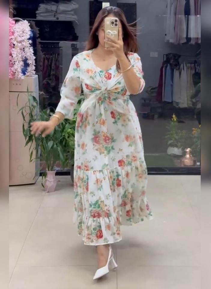 เดรสยาวลายดอกไม้สไตล์ลำลองน่ารักแฟชั่นใหม่ประจำฤดูร้อนปี 2026 ซักได้ ทรงเวสเทิร์น สำหรับผู้หญิงไซส์พลัส คอวี ผ้าจอร์เจตต์
