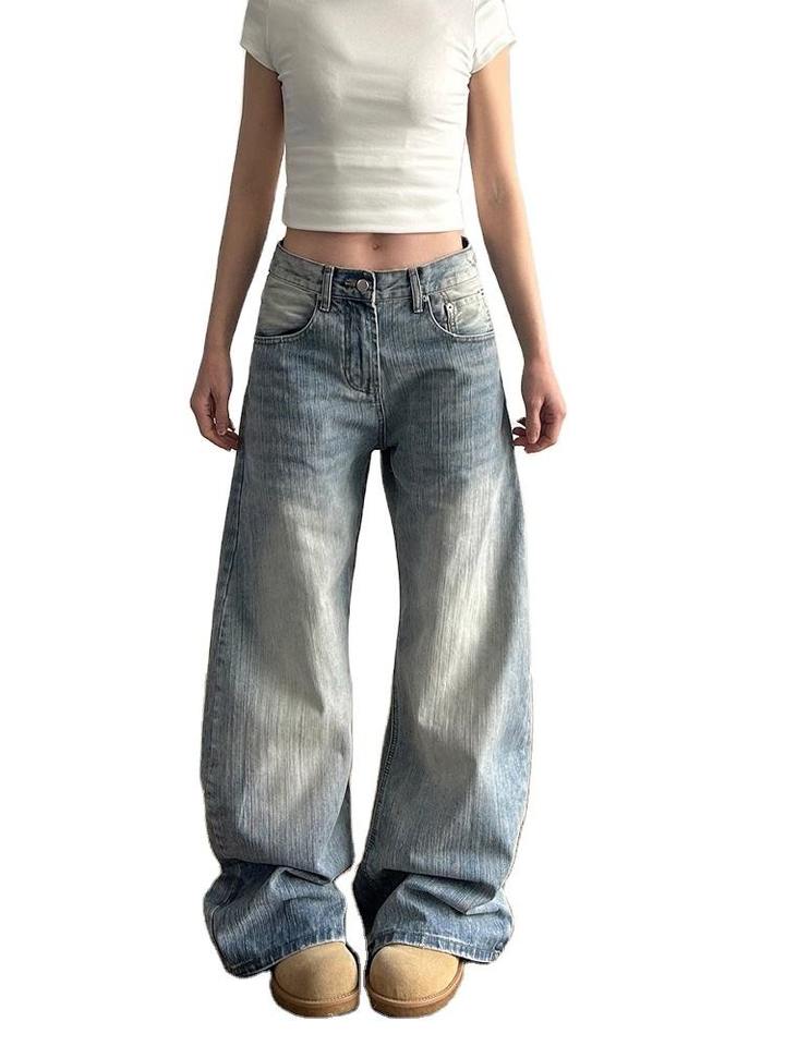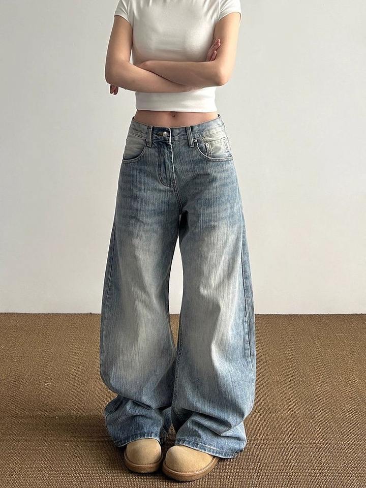 กางเกงยีนส์ทรงตรงขาเรียวยาวสไตล์อเมริกันย้อนยุคสำหรับผู้หญิง รุ่นใหม่ประจำฤดูร้อนปี 2026 ผ้าเดนิมลายสลับแบบวินเทจทรงหลวม