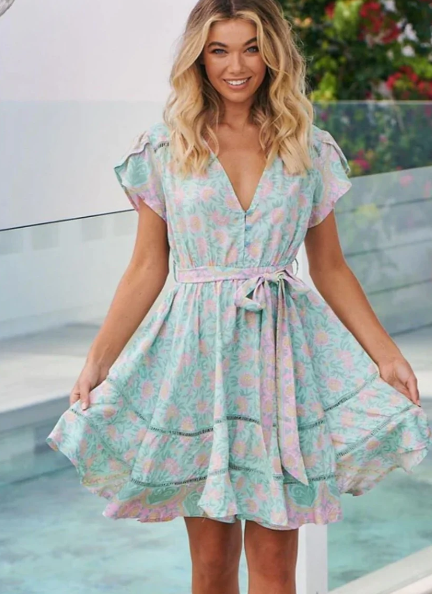 เดรสสั้นพิมพ์ลายแฟชั่นฤดูร้อนปี 2026 สำหรับผู้หญิง แขนสั้น แต่งระบาย สไตล์ลำลอง