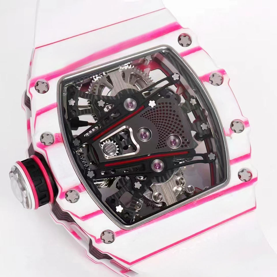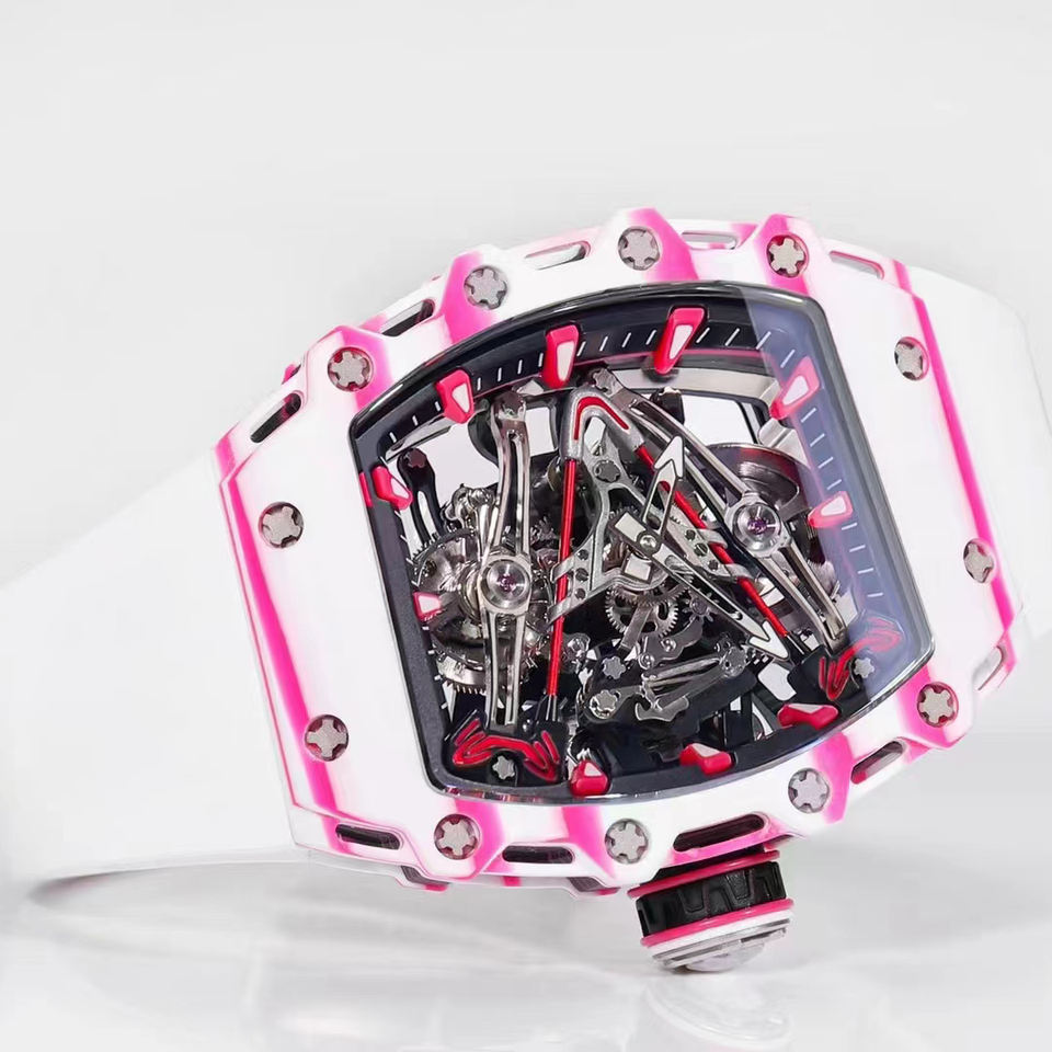 นาฬิกาข้อมือผู้ชายรุ่นปี 2026 ดีไซน์พิเศษแบบสั่งทำพิเศษ โครงสร้างแบบ Skeleton หรูหรา ตัวเรือนคาร์บอนไฟเบอร์ไล่เฉดสีขาวชมพู นาฬิกาสปอร์ต ของขวัญสุดหรู