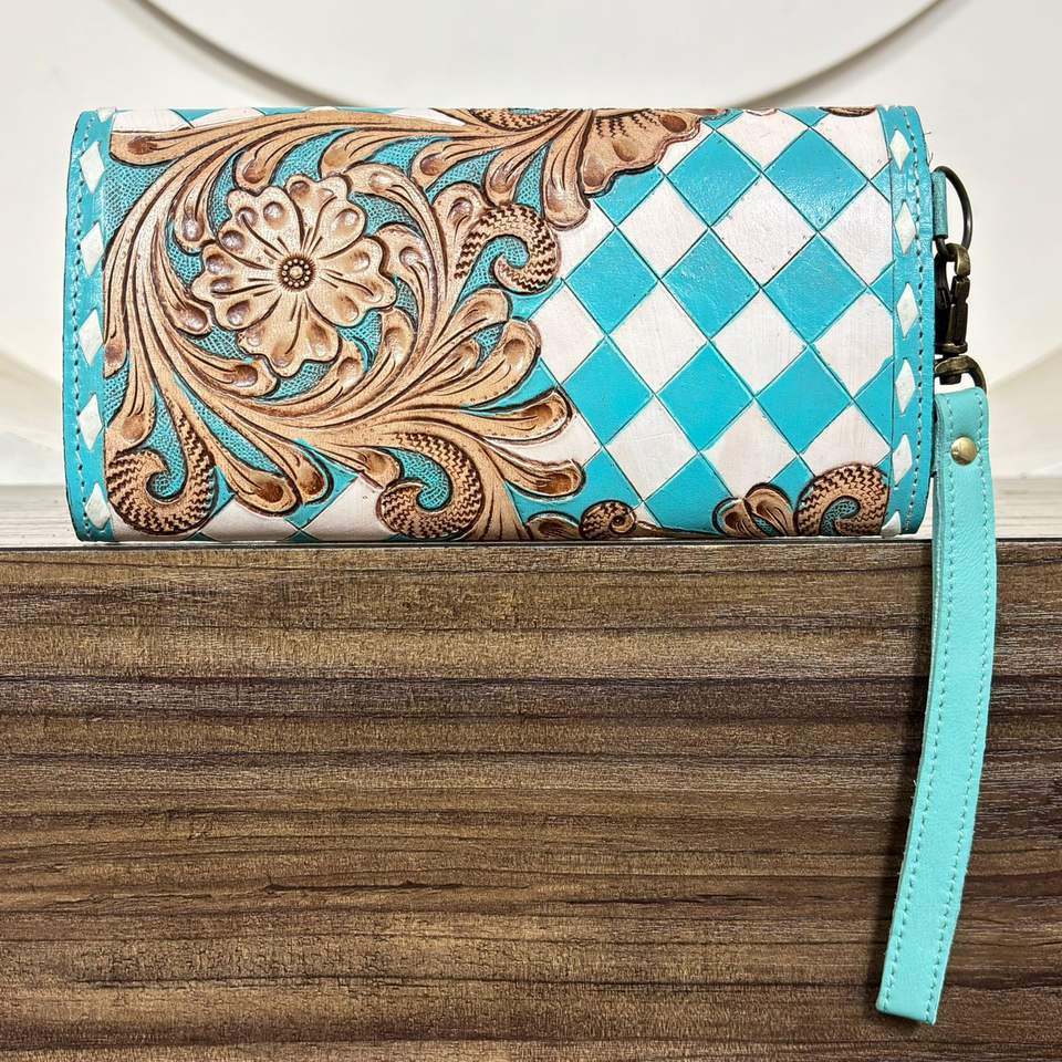 Product name:Hand Tooled Checkered Leather Wristlet Wallet
