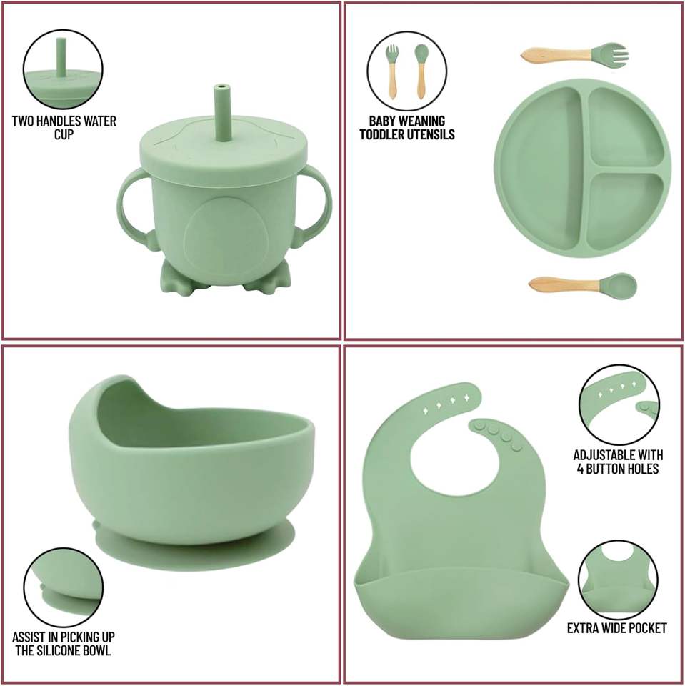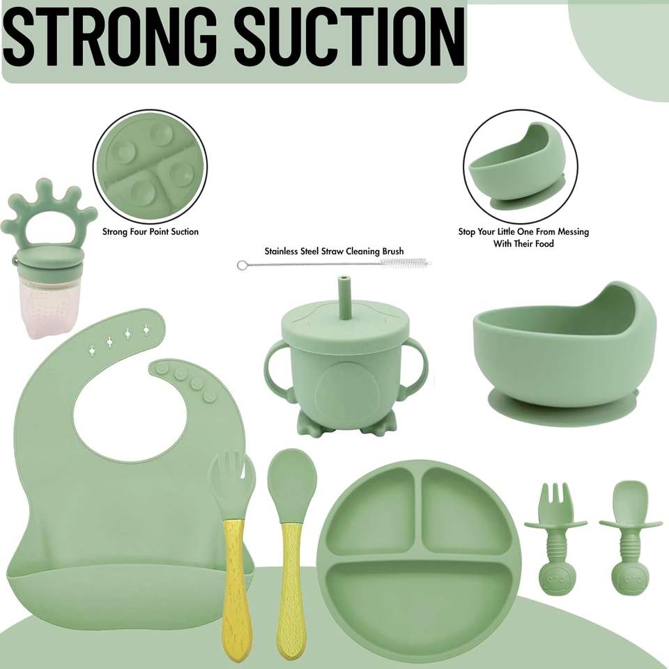ชุดอาหารเด็ก 13 ชิ้น รุ่นขายดีปี 2026 ชามพร้อมจุกดูด จาน ช้อน ส้อม ผ้ากันเปื้อนปรับได้ ปลอดสาร BPA ผลิตจากซิลิโคนเกรดอาหาร สำหรับเด็กอายุ 0-12 เดือน