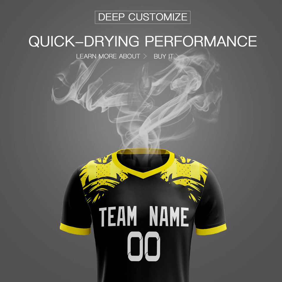 ชุดฟุตบอลสั่งทำสุดฮิตปี 2026 ดีไซน์ทันสมัย ราคาประหยัด สีดำเหลือง ครบชุด กันน้ำ แห้งเร็ว ผลิตจากโพลีเอสเตอร์ 100% บริการ OEM