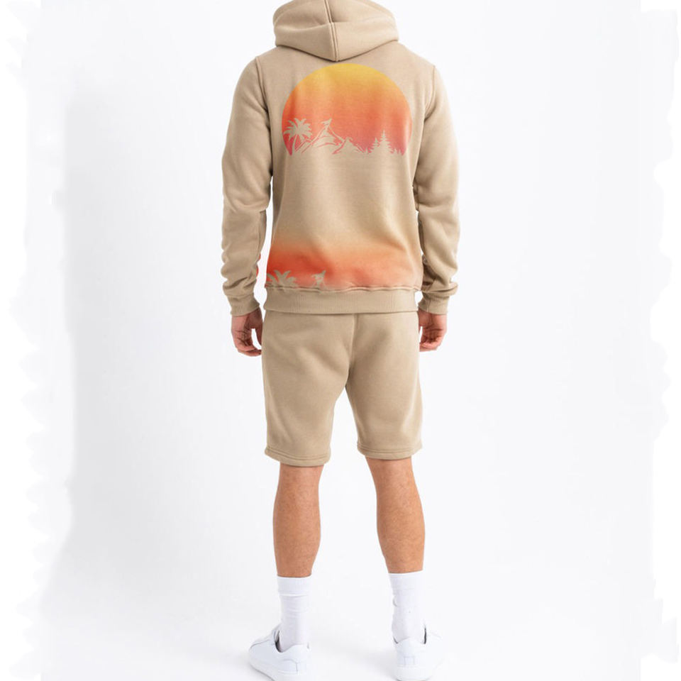 ชุดฮู้ดดี้และกางเกงขาสั้นสกรีนลายตามเทรนด์ปี 2026 ผ้าฝ้ายฟลีซ 100% GSM สูง สำหรับใส่ลำลองหรือชุดกีฬา สำหรับทุกเพศ