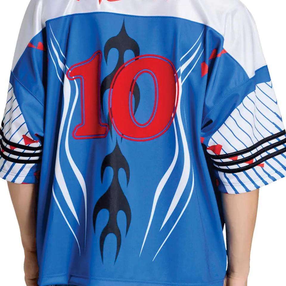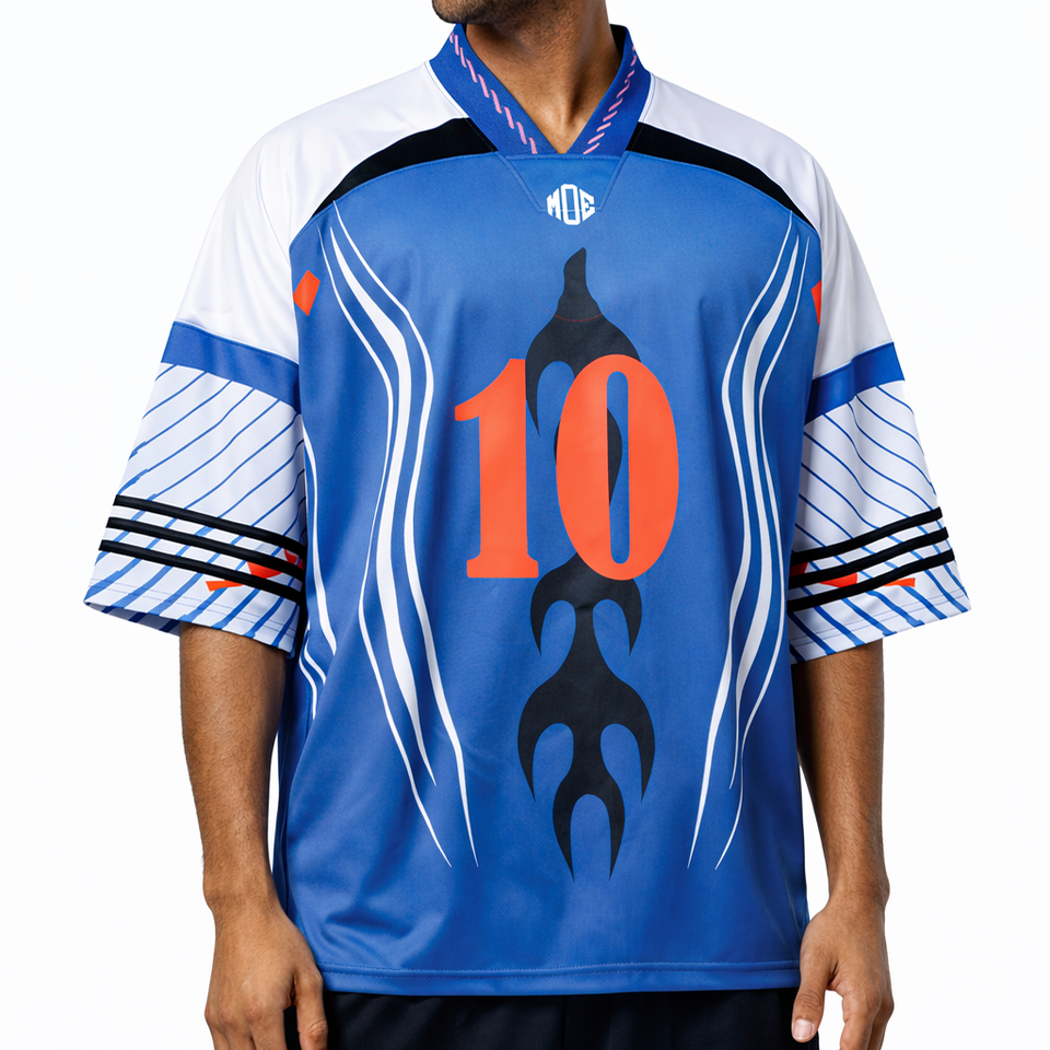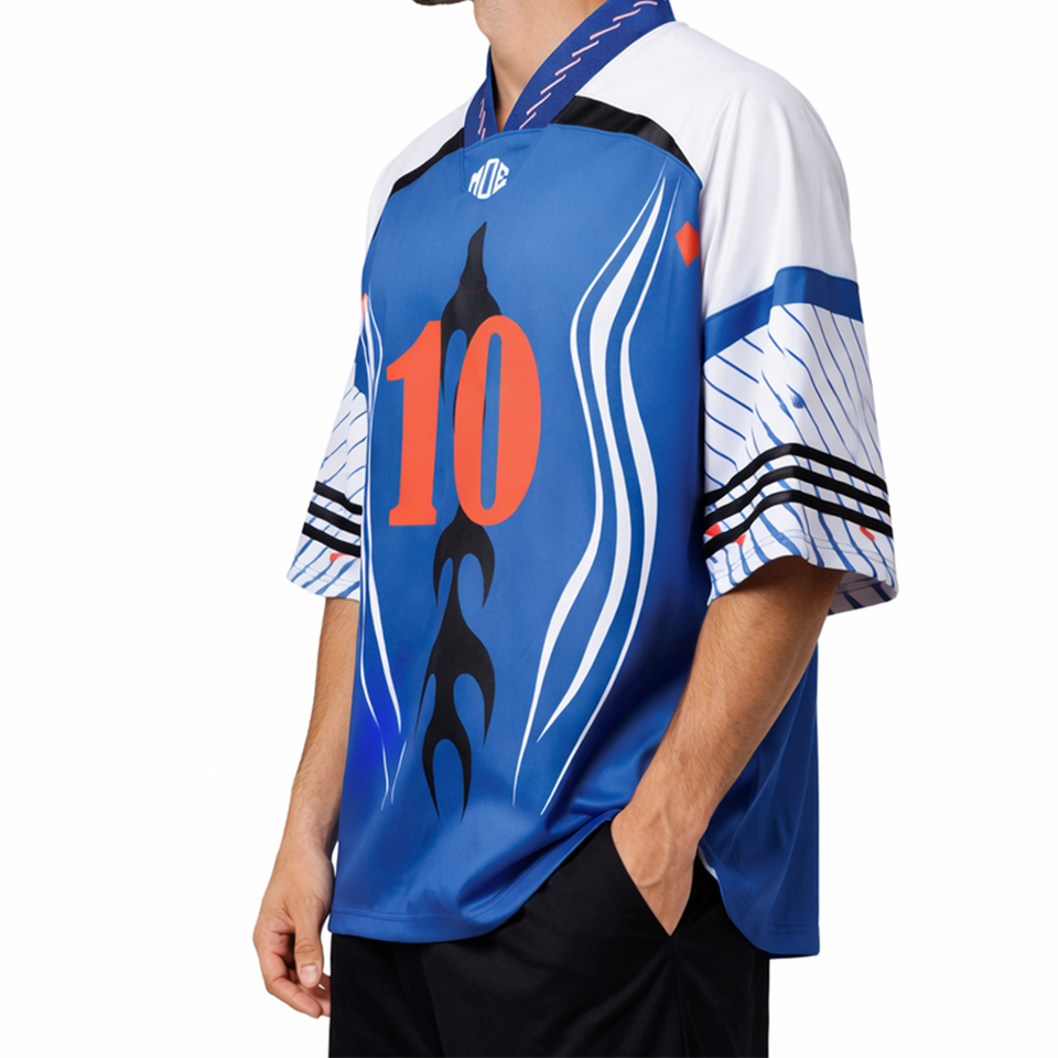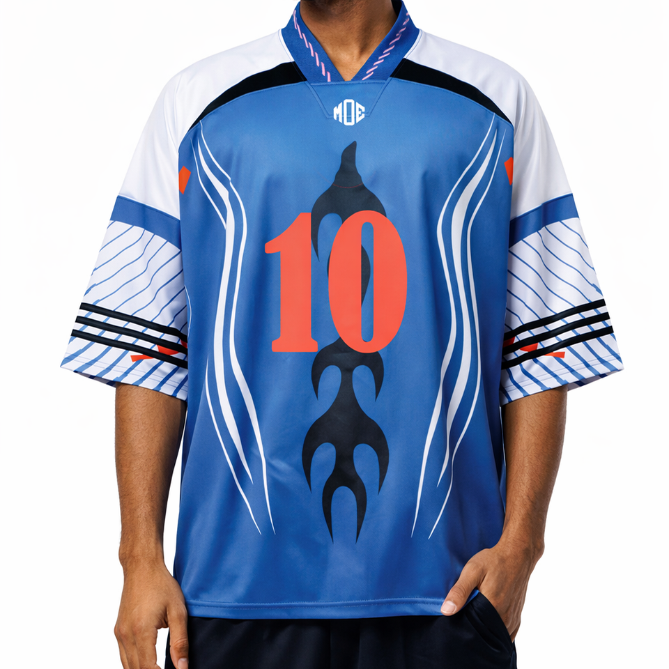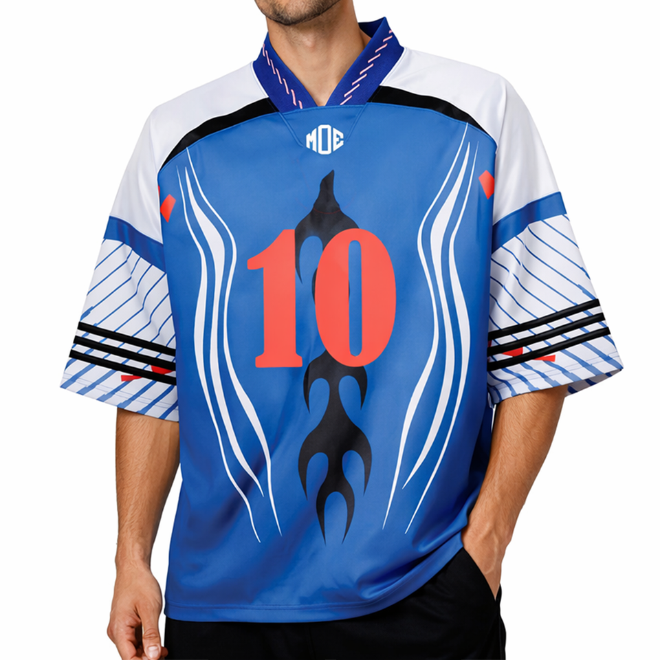 เสื้อฟุตบอลอเมริกันแบบซับลิเมชั่นสีน้ำเงิน ดีไซน์ทันสมัยปี 2026 คอวีทรงโอเวอร์ไซส์ ผลิตจากโพลีเอสเตอร์ รับผลิตจำนวนมากแบบ OEM