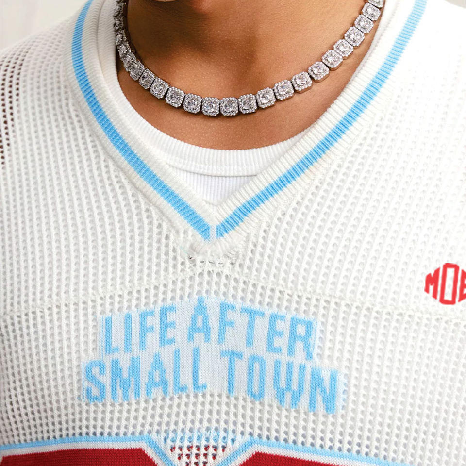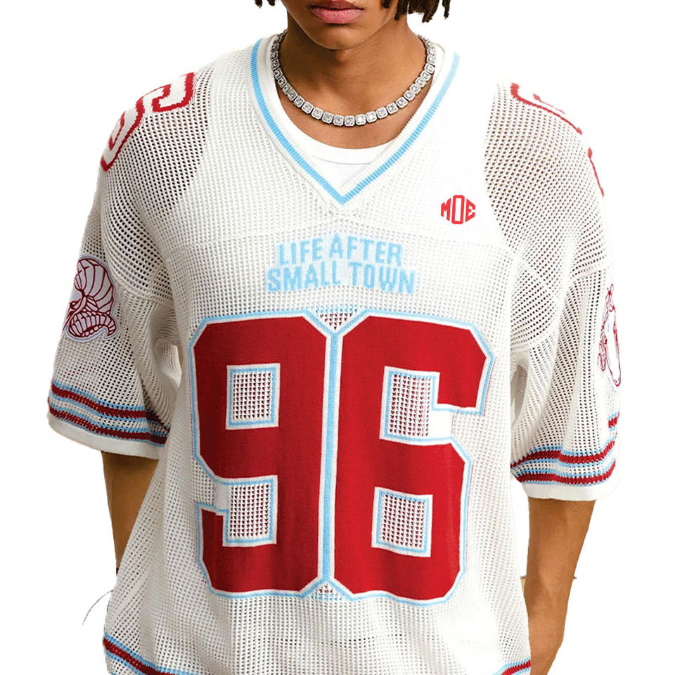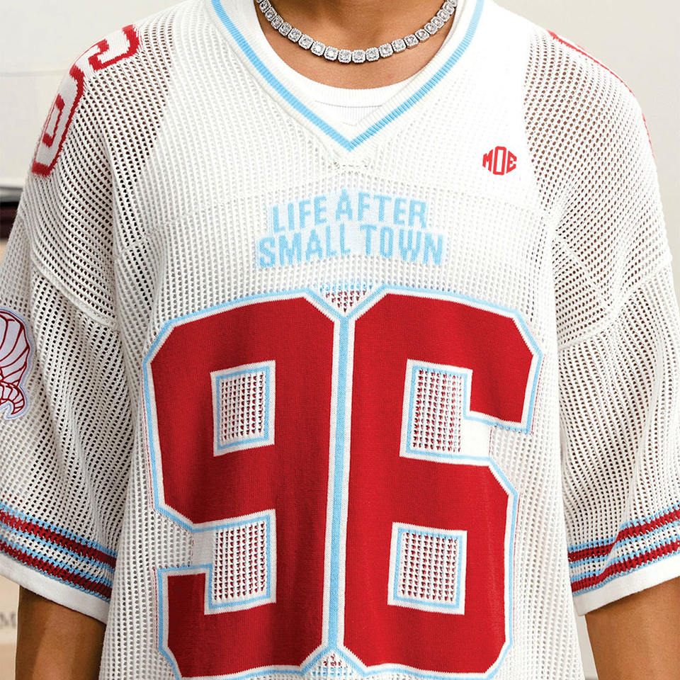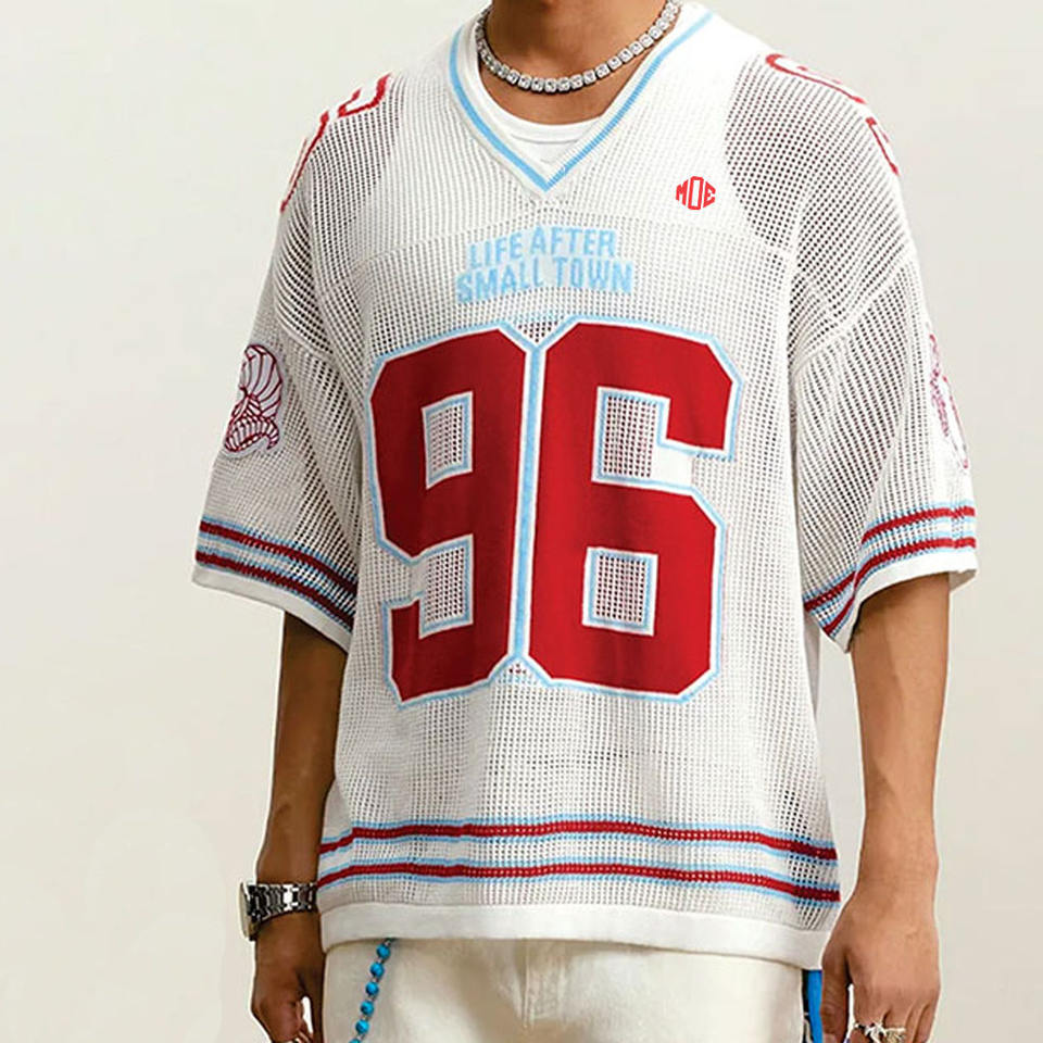 เสื้อผ้าผู้ชายสไตล์อเมริกันฟุตบอลแบบถักตาข่ายทันสมัยปี 2026 ผ้าโพลีเอสเตอร์ 240 GSM ทรงโอเวอร์ไซส์ สตรีทแวร์ รับผลิตตามสั่ง OEM ขายส่งจากโรงงาน