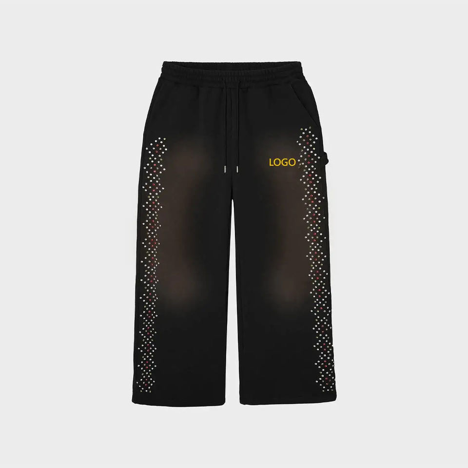 กางเกงแทร็คผ้าฝ้ายเฟรนช์เทอร์รี่ทรงขาบานแบบยูนิเซ็กซ์ปี 2026 ลวดลายซีดจางแบบฟอกสี น้ำหนักเบา แต่งคริสตัล