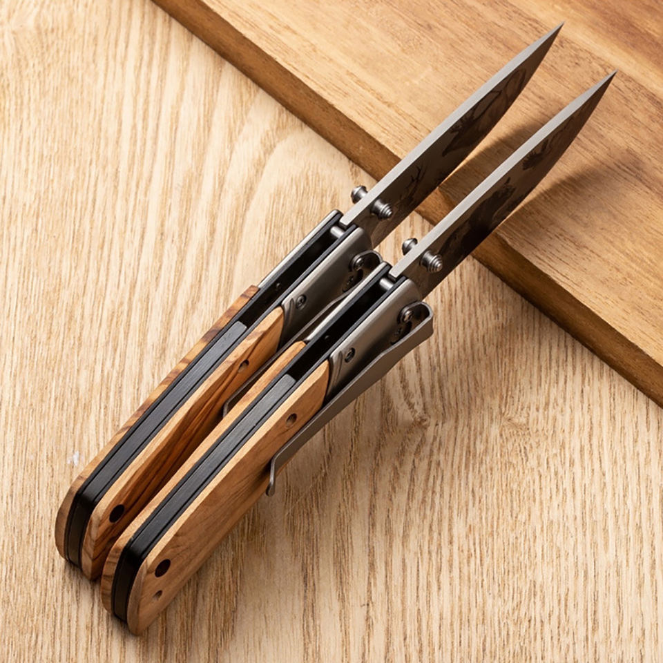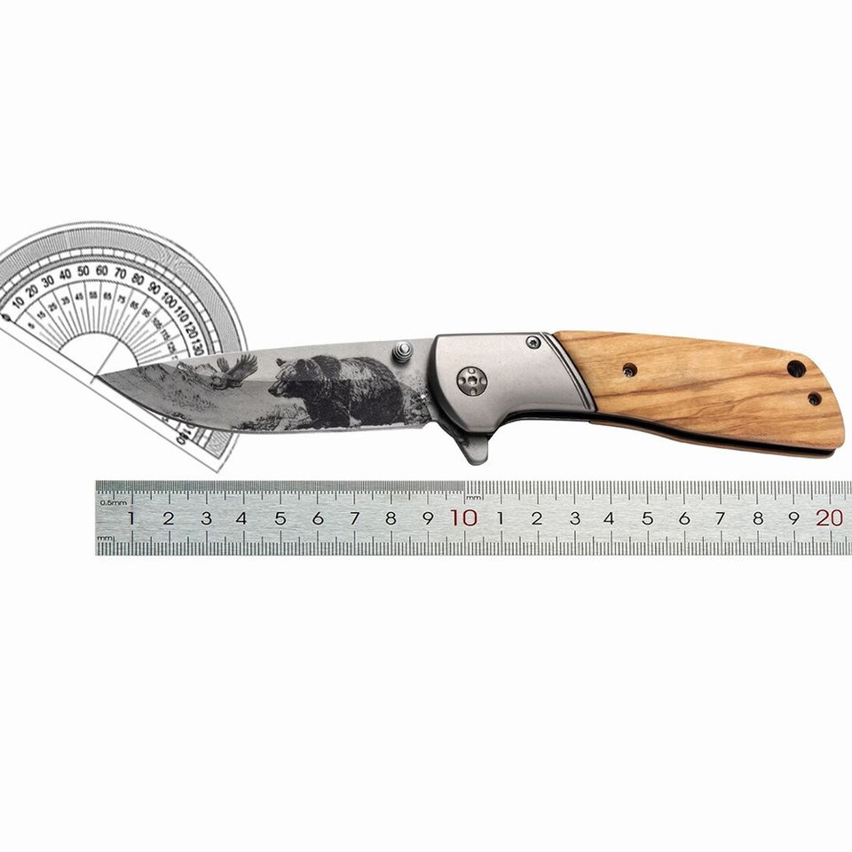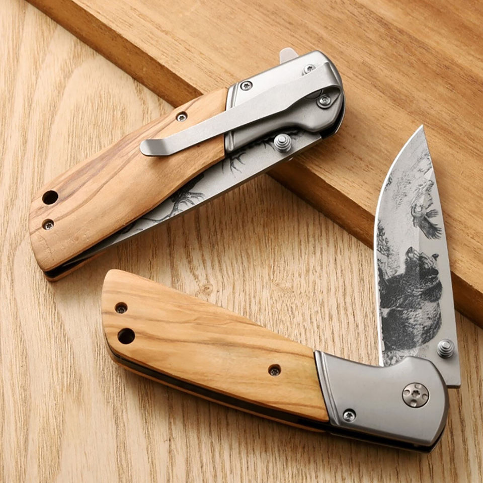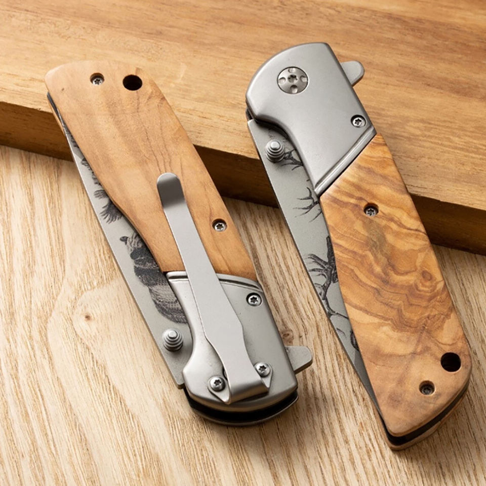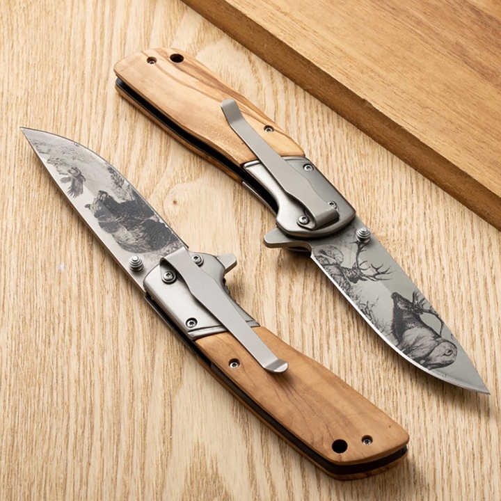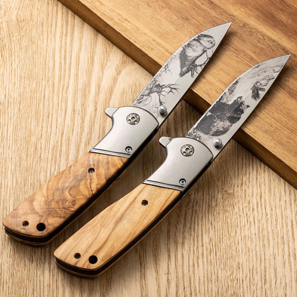 มีดพับลายสัตว์สลักแบบขายส่งปี 2026 พร้อมโลโก้สั่งทำ ด้ามไม้ ของขวัญ มีดพกพา EDC สำหรับตั้งแคมป์ ล่าสัตว์ กิจกรรมกลางแจ้ง