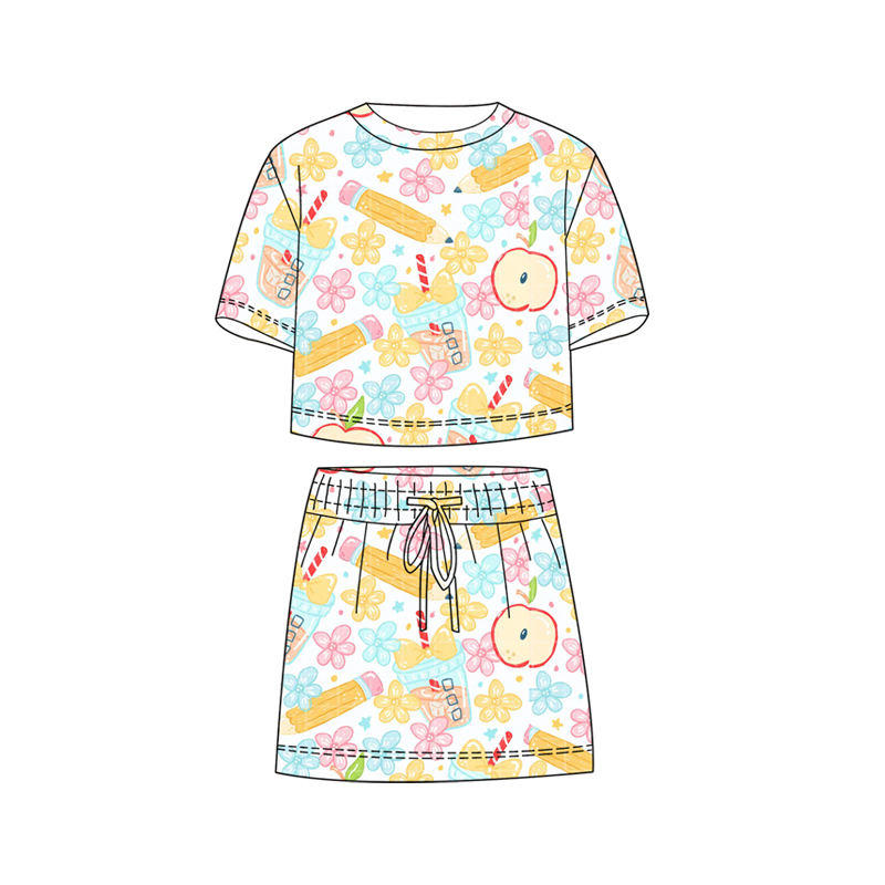 ชุดเสื้อยืดแขนสั้นพิมพ์ลายโบว์สีน้ำเงินพร้อมกางเกงขาสั้นสำหรับเด็กผู้หญิง ฤดูร้อน ปี 2026 ขายส่ง เหมาะสำหรับกลับไปโรงเรียน ผลิตจากโพลีเอสเตอร์เนื้อนุ่ม ยืดหยุ่นได้