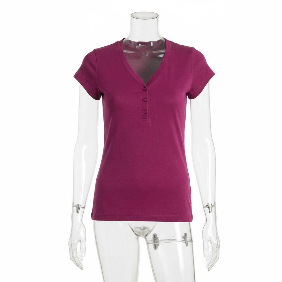เสื้อยืดผู้หญิงขายส่งปี 2026 ดีไซน์ใหม่ สีพื้น ผ้าถัก ติดกระดุม คอกลม แขนสั้น เสื้อลำลอง