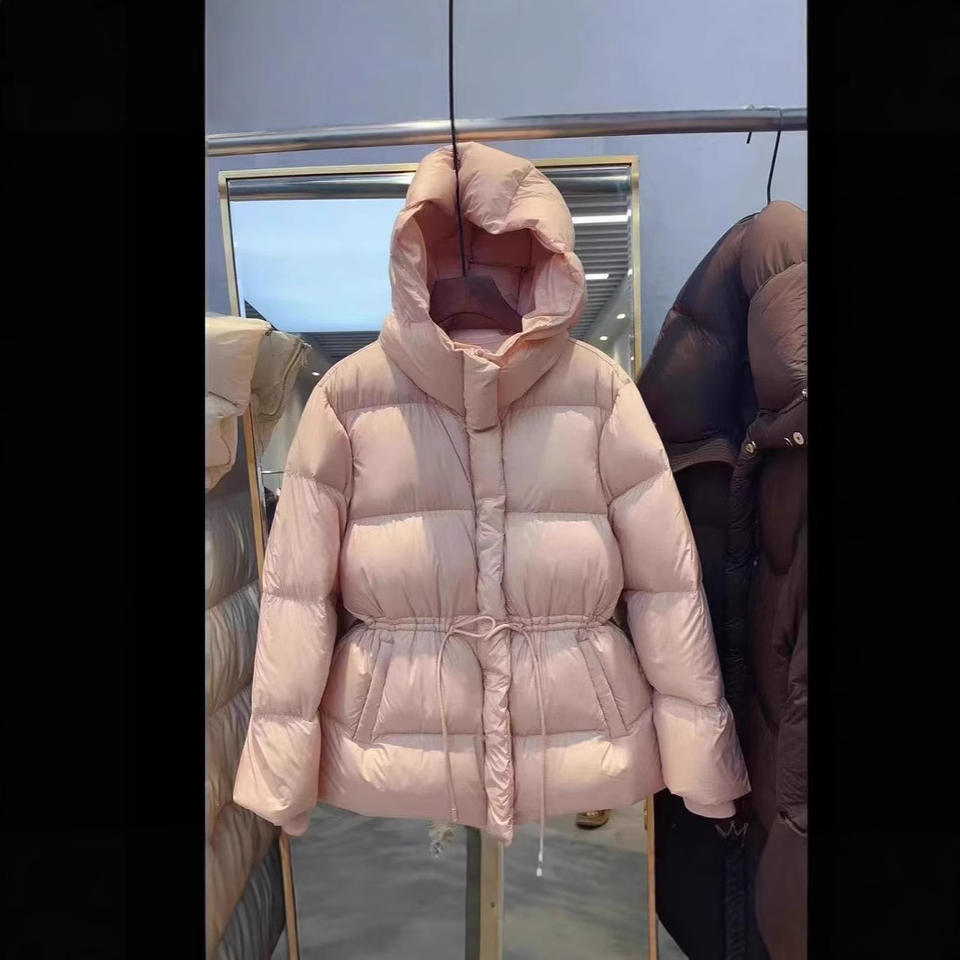 เสื้อโค้ทสีขาวแฟชั่นฤดูหนาวปี 2026 แจ็คเก็ตพัฟเฟอร์ระดับไฮเอนด์ คอปกมีฮู้ด รัดเอว ดีไซน์สุดเก๋สำหรับผู้หญิง