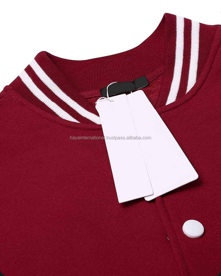 แจ็คเก็ตวาร์ซิตี้ฤดูหนาวปี 2026 สำหรับผู้ชาย ขายส่ง แขนผ้าฟลีซ 100% ผ้าฝ้าย ปักลายส่วนตัว สีแดง โลโก้ด้านหน้าแบบตั้ง