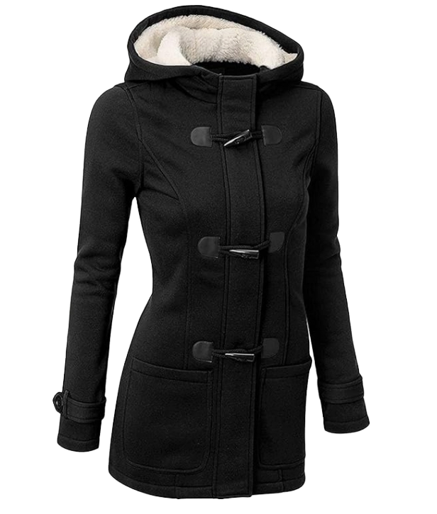 เสื้อแจ็คเก็ตถักสำหรับผู้หญิง ฤดูใบไม้ผลิ ปี 2026 ดีไซน์ใหม่ ไซส์ใหญ่ พร้อมฮู้ด กระดุมเขาสัตว์ กันลม มีกระเป๋าผ้าฝ้าย ยาว
