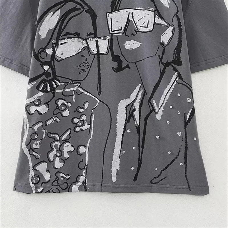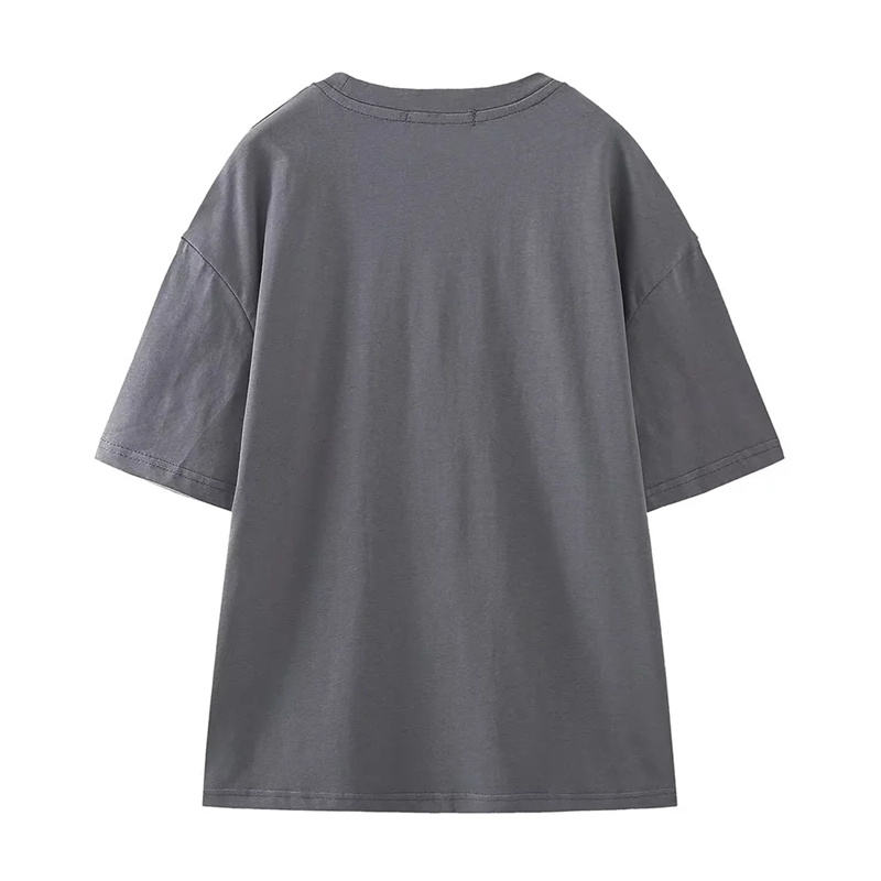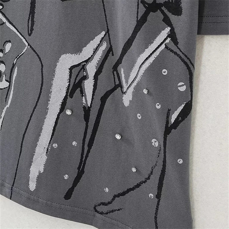 เสื้อยืดแขนสั้นผู้หญิงคอลเลคชั่นฤดูร้อนปี 2026 คอกลมทรงหลวมสไตล์เรโทรสีเทาพิมพ์ลาย