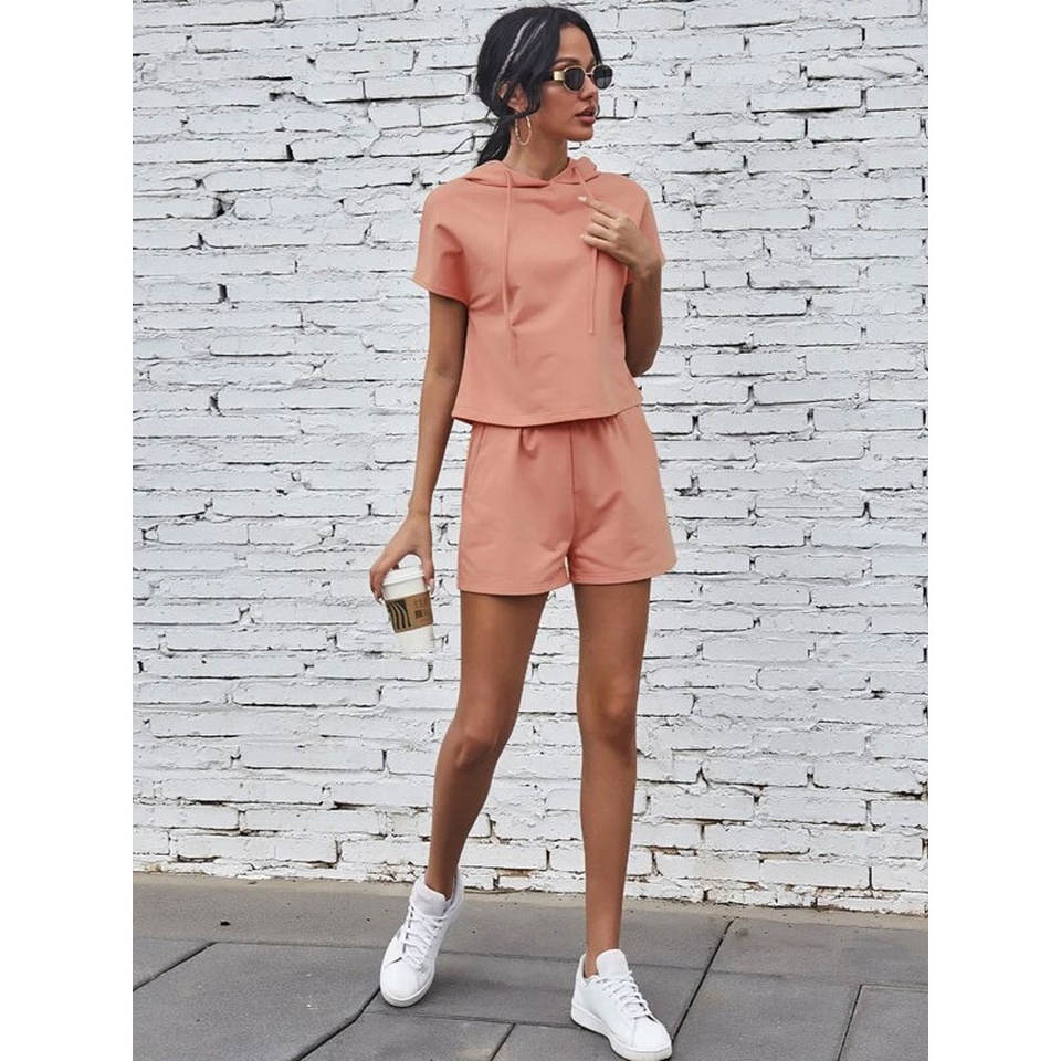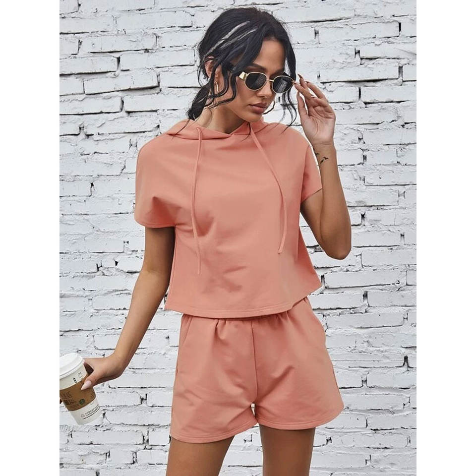 ชุดวอร์มฤดูร้อนสำหรับผู้หญิง ปี 2026 ชุดลำลองแบบสวมใส่สบาย เสื้อฮู้ดและกางเกงขาสั้น สีพื้น แฟชั่นชุดกีฬา