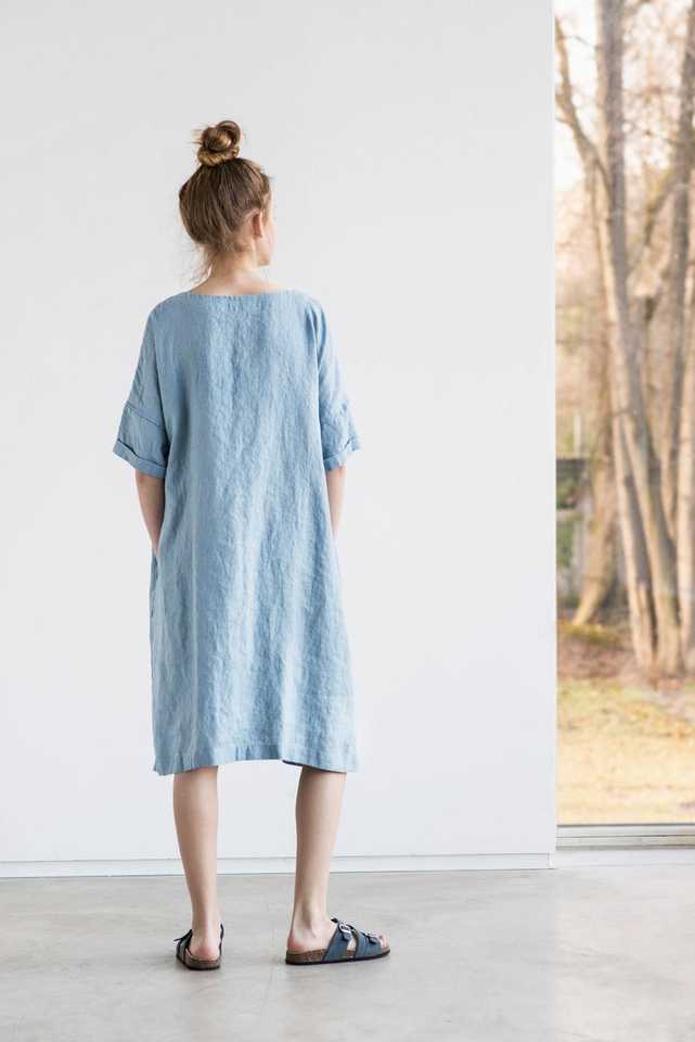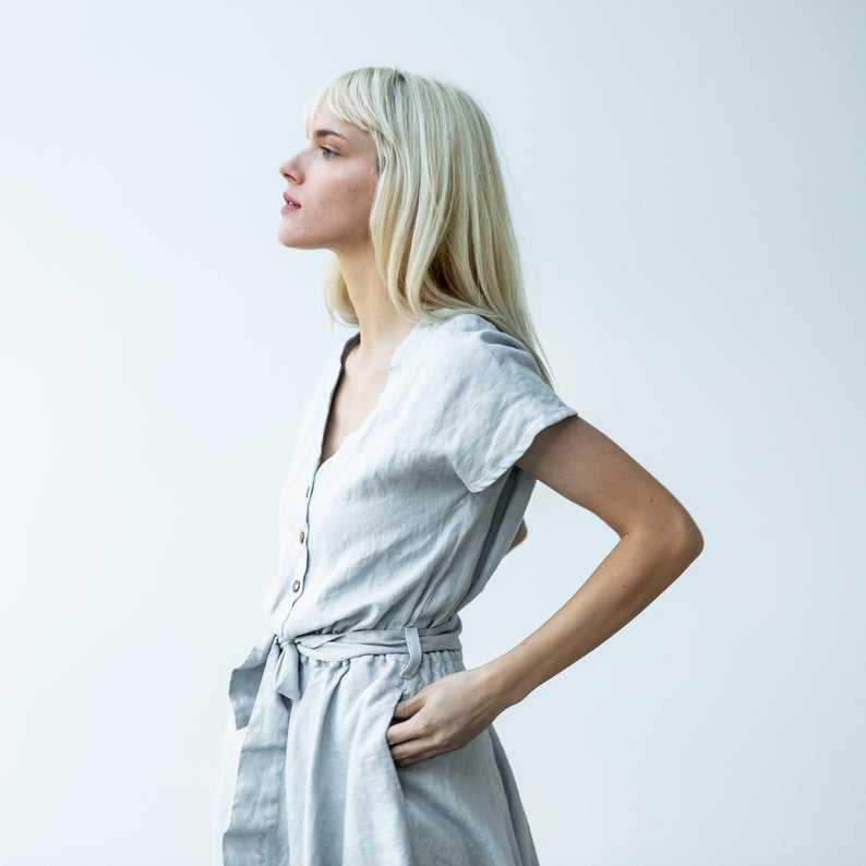 เดรสผ้าลินินสีเทาอ่อนสุดฮิตแฟชั่นล่าสุดประจำปี 2026 สำหรับฤดูร้อน แขนสั้น มีกระเป๋า ดีไซน์เซ็กซี่ ผ้าลินิน 100%