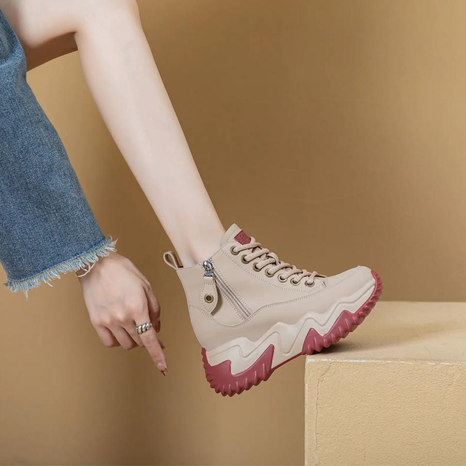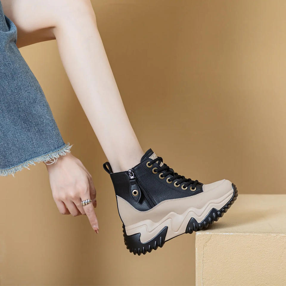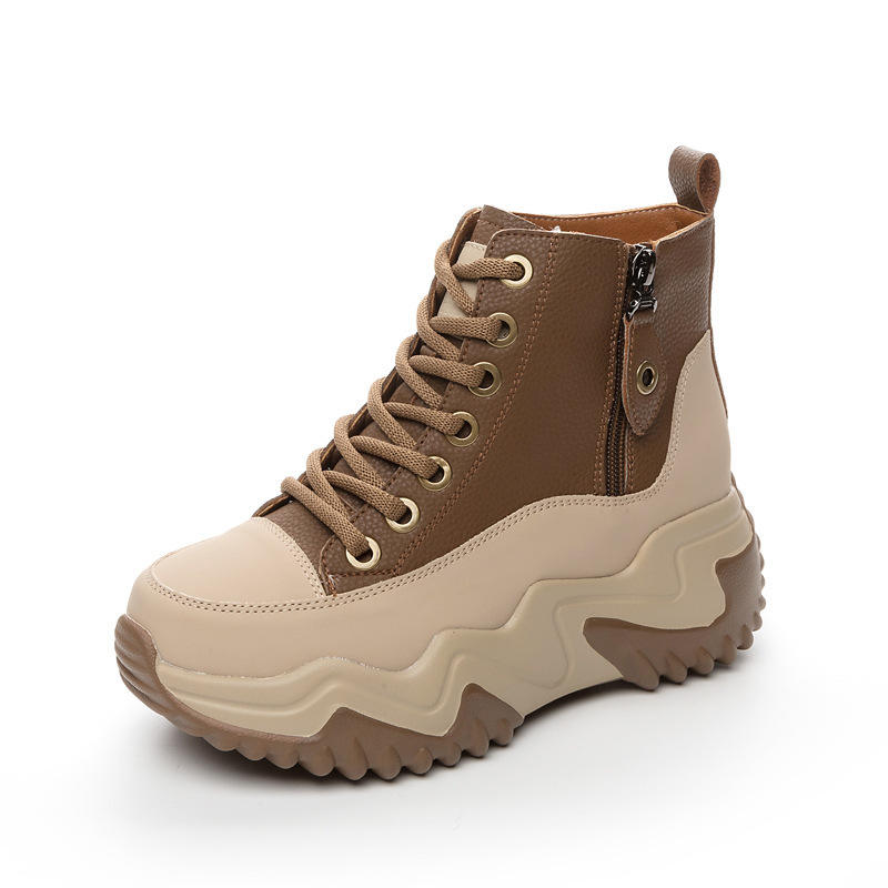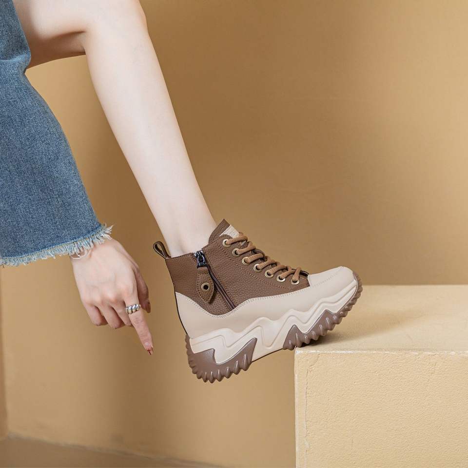 รองเท้าลำลองผู้หญิงรุ่นใหม่ประจำฤดูใบไม้ร่วงปี 2026 รองเท้าบูทสั้นเสริมส้นหนา 7 ซม. แฟชั่นเพิ่มความสูง รองเท้าผู้หญิงแบบผูกเชือกหุ้มข้อสูง