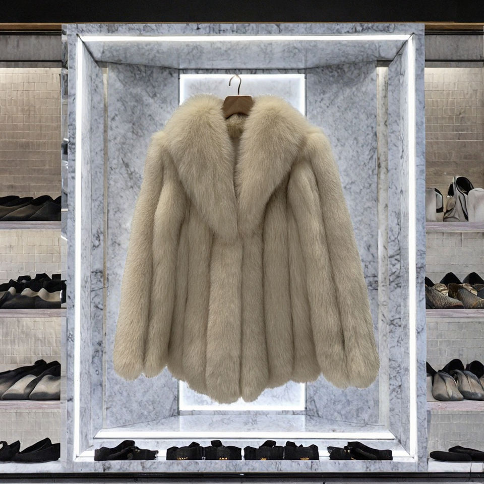 เสื้อแจ็คเก็ตขนสุนัขจิ้งจอก 2026 สีขาว แต่งขอบขนสุนัขจิ้งจอกแท้ เสื้อโค้ทกันหนาว แขนเสื้อคริสตัลโลโก้ ราคาถูก ข้อมือเสื้อสั่งทำ สไตล์วินเทจ