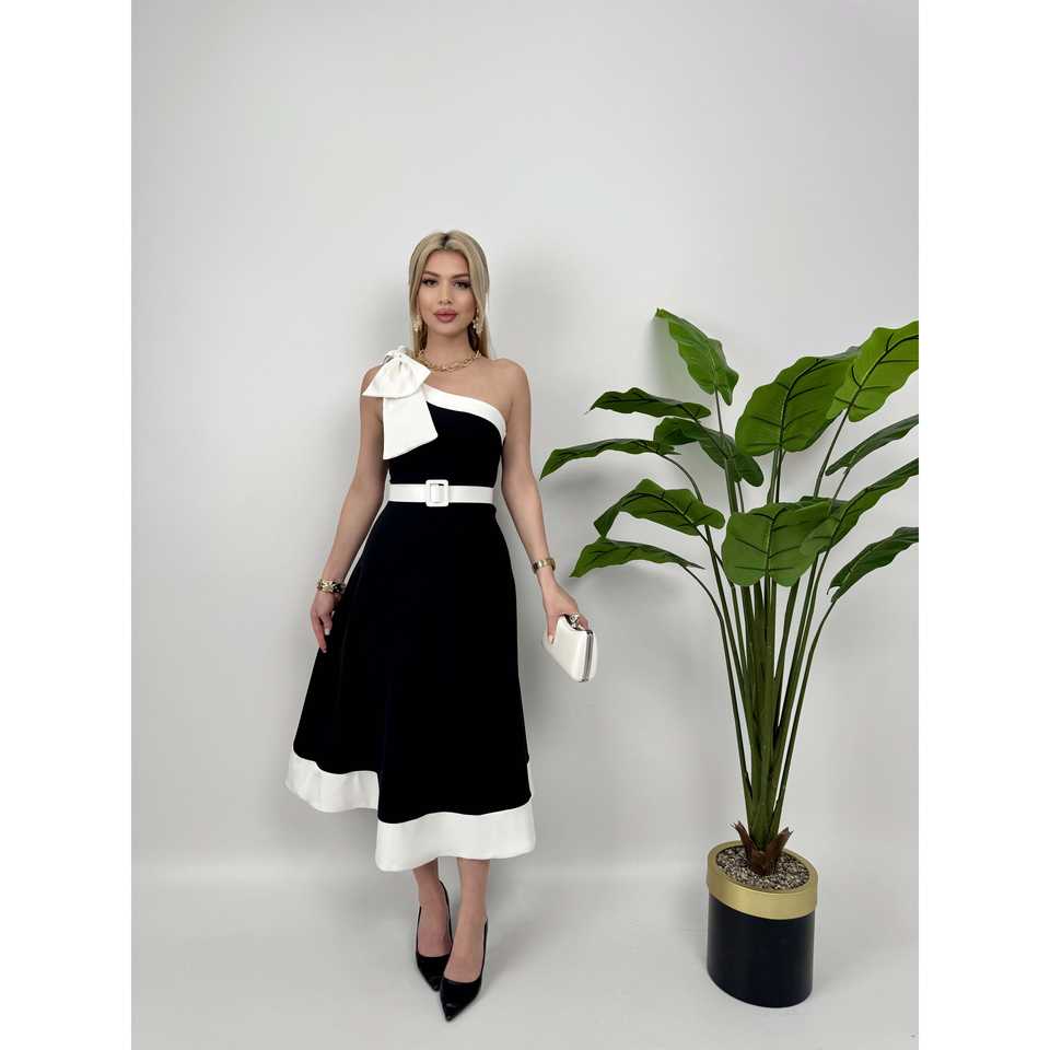 ชุดเดรสทรงเอไลน์แบบไหล่เดียวผ้าซาตินปี 2040 พร้อมโบว์และเข็มขัด โดดเด่นด้วยดีไซน์เอวธรรมชาติ