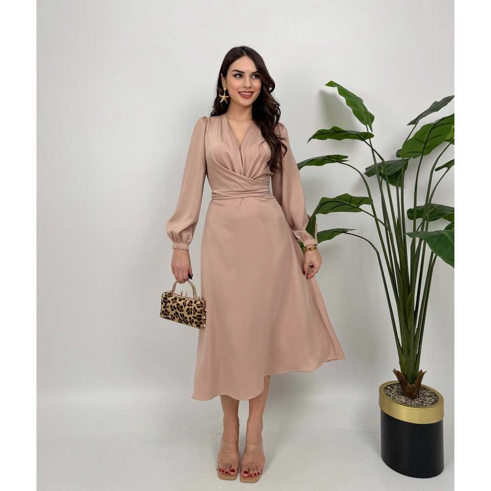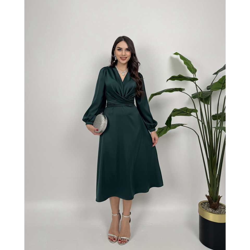 ชุดเดรสผ้าซาตินทรงเอไลน์ปี 2052 พร้อมเข็มขัดและเอวธรรมชาติ