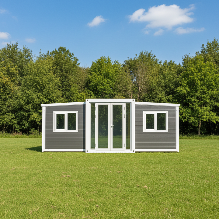 บ้านคอนเทนเนอร์ขนาด 20 ฟุต 2 ห้องนอน สีเทา แบบขยายได้ พร้อมแผงผนังภายนอก