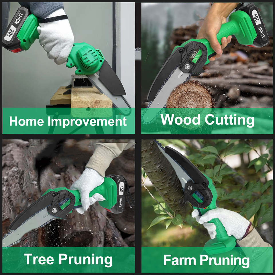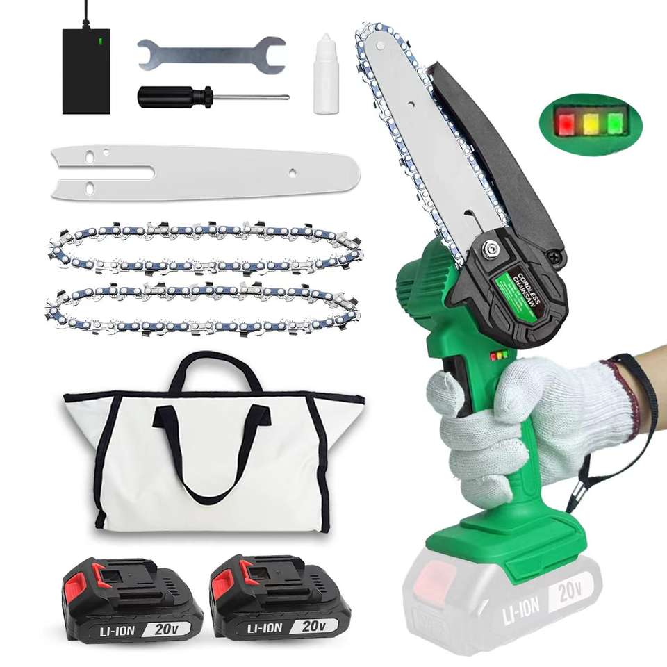 เลื่อยโซ่ไร้สายขนาดเล็ก 20V Li-ion แบตเตอรี่ 150 มม. สำหรับเลื่อยไม้ งานอุตสาหกรรม DIY สีเขียว เลื่อยไฟฟ้า
