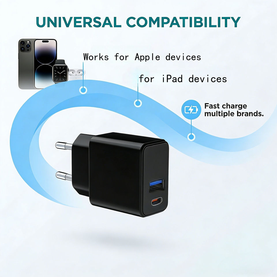 อะแดปเตอร์ชาร์จเร็ว 20W หัวปลั๊ก EU แบบ USB-C ชาร์จเร็วสองพอร์ต PD QC3.0 สำหรับ iPhone 17 16 15 14 13 สมาร์ทวอทช์ และหูฟัง