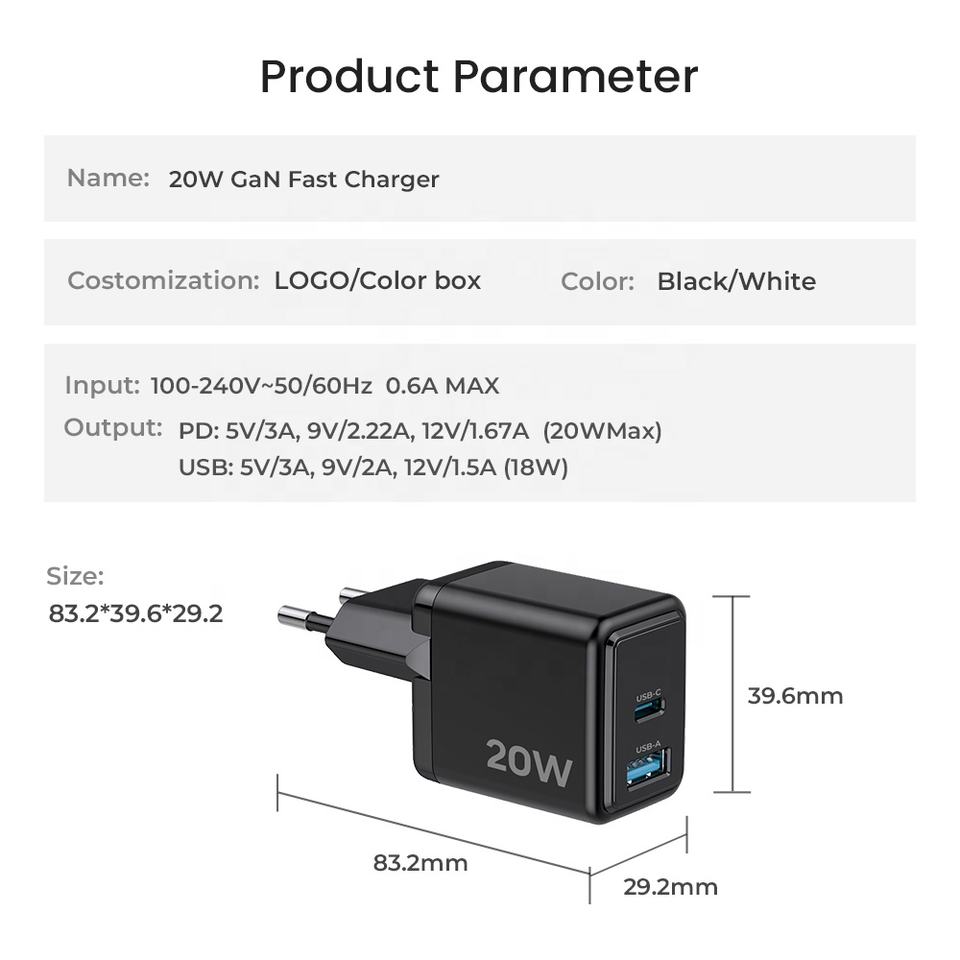 อะแดปเตอร์ชาร์จเร็ว 20W GaN PD สำหรับแล็ปท็อปและกล้อง พร้อมปลั๊กพับได้ (EU/US/UK)-ราคาโรงงาน