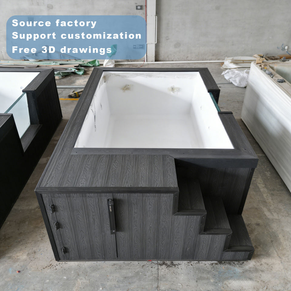 สระว่ายน้ำสำเร็จรูปติดตั้งง่าย พร้อมหน้าต่างอะคริลิกแบบกำหนดเอง โครงสร้างไฟเบอร์กลาสและไม้ มีจำหน่าย
