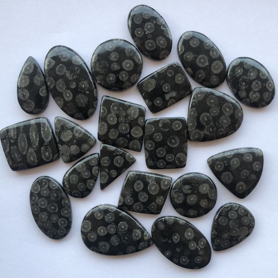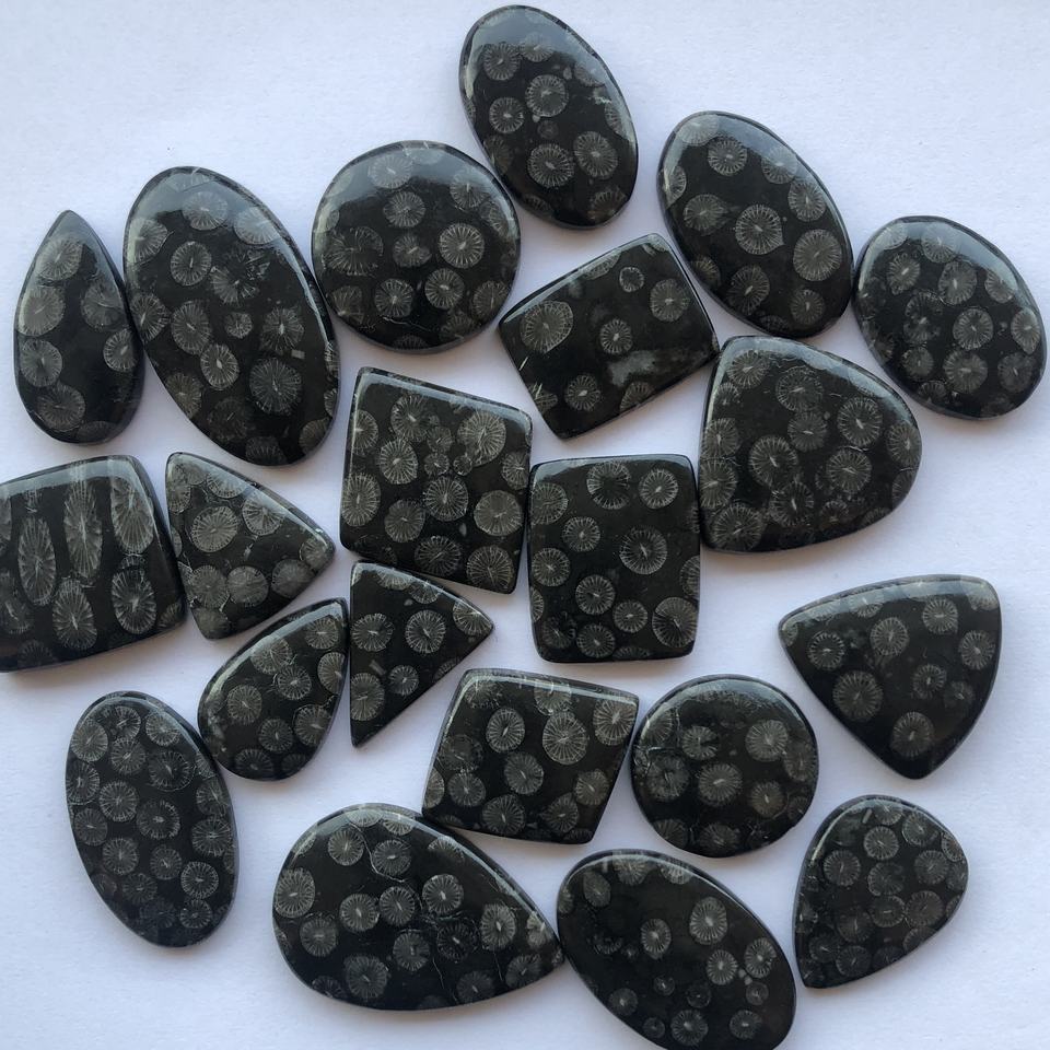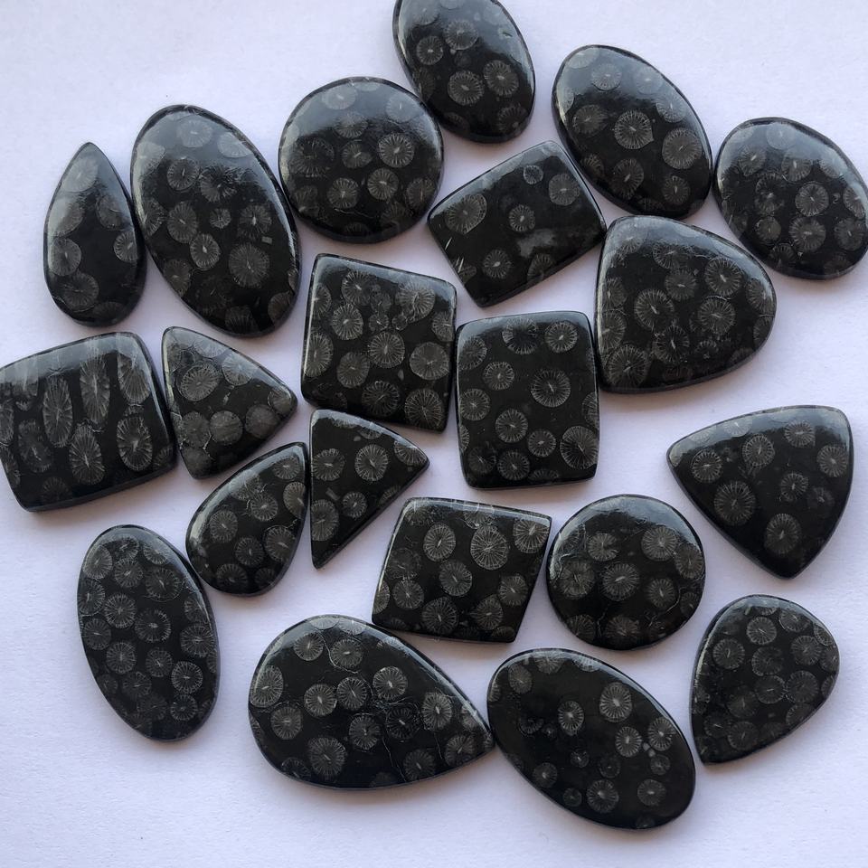 ชื่อสินค้า:ปะการังฟอสซิลสีดำ ขนาดฟรี ขัดเงาเรียบ รูปทรงผสม แบบหลวม ทรงคาโบชอง