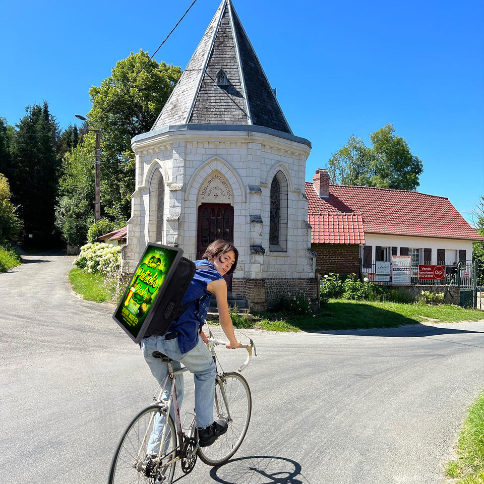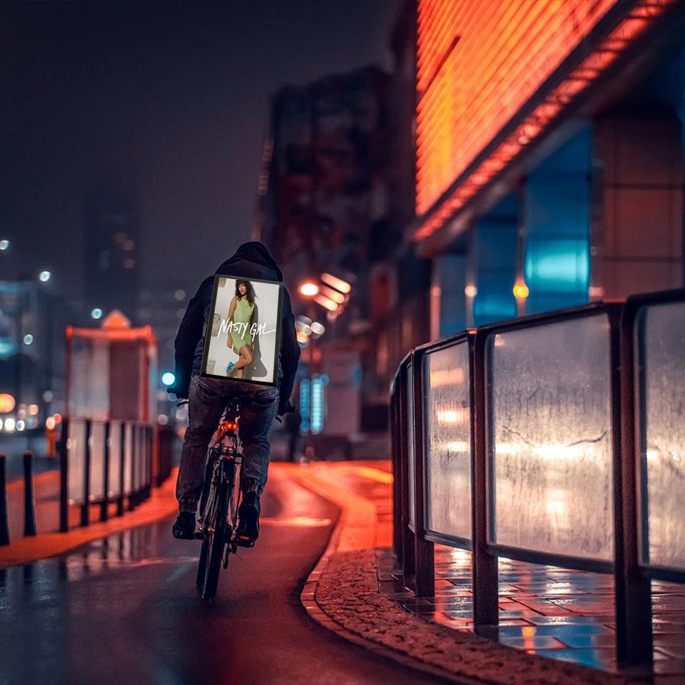 21.5นิ้วกระเป๋าเป้สะพายหลังโฆษณา LCD ป้ายโฆษณาดิจิตอลสำหรับมนุษย์เดินกระเป๋าเป้ป้ายโฆษณาพร้อมแบตเตอรี่ในตัว