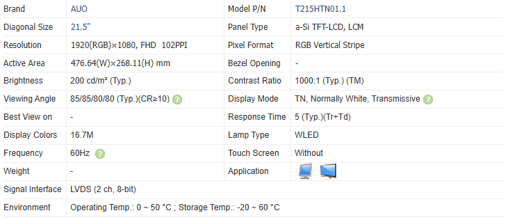 โมดูลจอแอลซีดี TFT ขนาด 21.5 นิ้ว รุ่น T215HTN01.1 ความละเอียด 1920x1080 ความสว่าง 200cd/m² อินเทอร์เฟซ LVDS ประหยัดพลังงาน LCM
