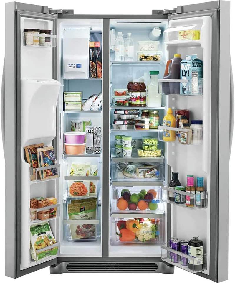 22.3 คิว ฟุต ตู้เย็นสแตนเลสแบบเคียงข้างกันพร้อมเครื่องจ่ายน้ำ ระบบละลายน้ำแข็งอัตโนมัติ ควบคุมด้วยระบบอิเล็กทรอนิกส์ 4 ประตู ระบบทำความเย็นด้วยลม
