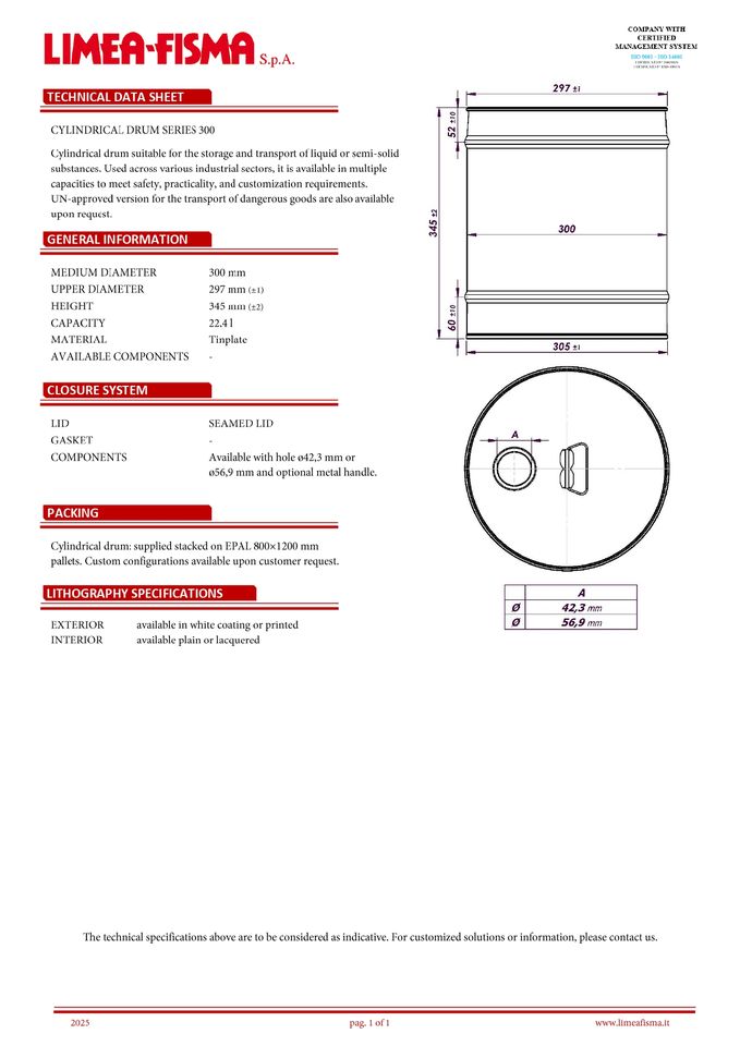 ถังทรงกระบอกเหล็กวิลาดขนาด 22.4 ลิตร เส้นผ่านศูนย์กลาง 300 x 345 มม. ปรับแต่งได้ พร้อมหูหิ้วและรูเท
